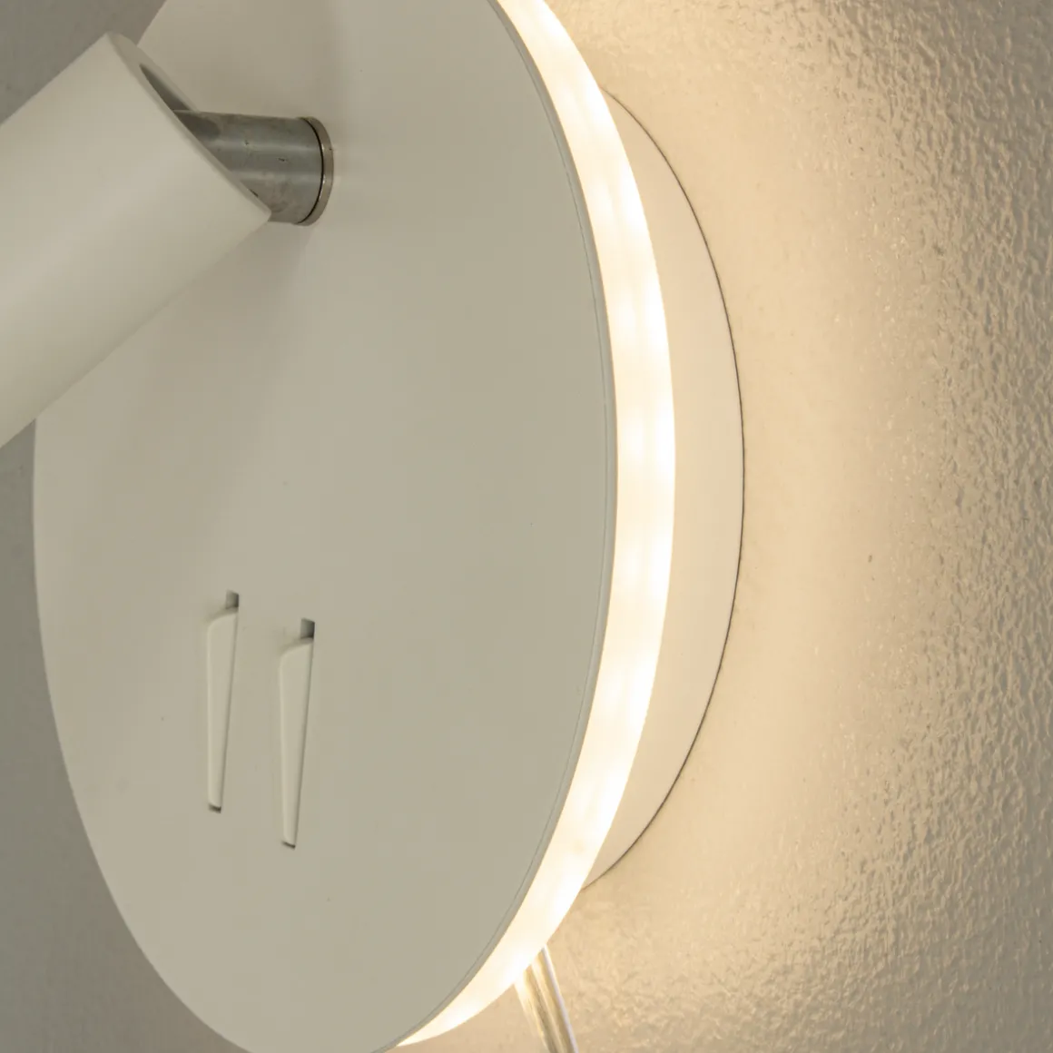 Vegglampe i metall med justerbar spot samt lys på baksiden av veggplaten.