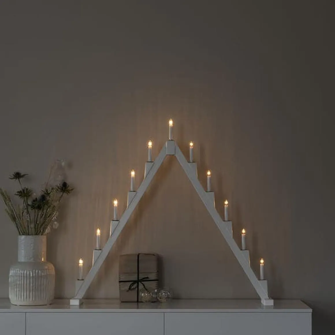 Klassisk adventslysestake i lakkert tre med elegante messingfargede metalllyshylser – en tidløs favoritt som sprer atmosfære i vintermørket. Med 11 varme hvite lys og et smart sammenleggbart design er den både vakker i vinduet og enkel å oppbevare til neste jul.