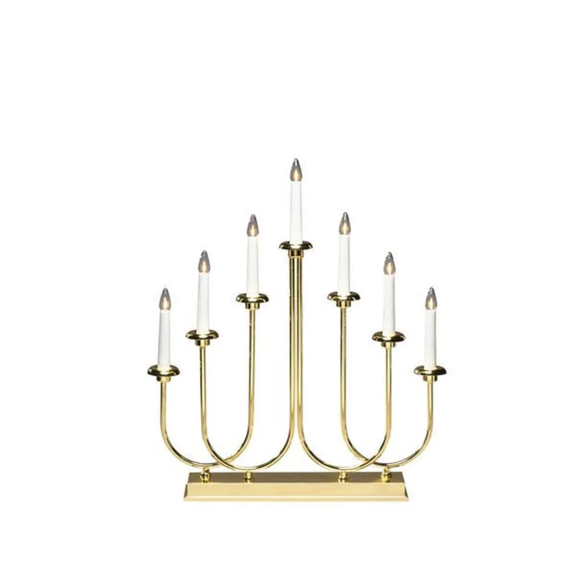 Adventstake 7 armet i messingbelagt metall. Adventstaken har klare pærer og den er utstyrt med inebygget dimmer slik at du selv kan bestemme ønsket lysstyrke.