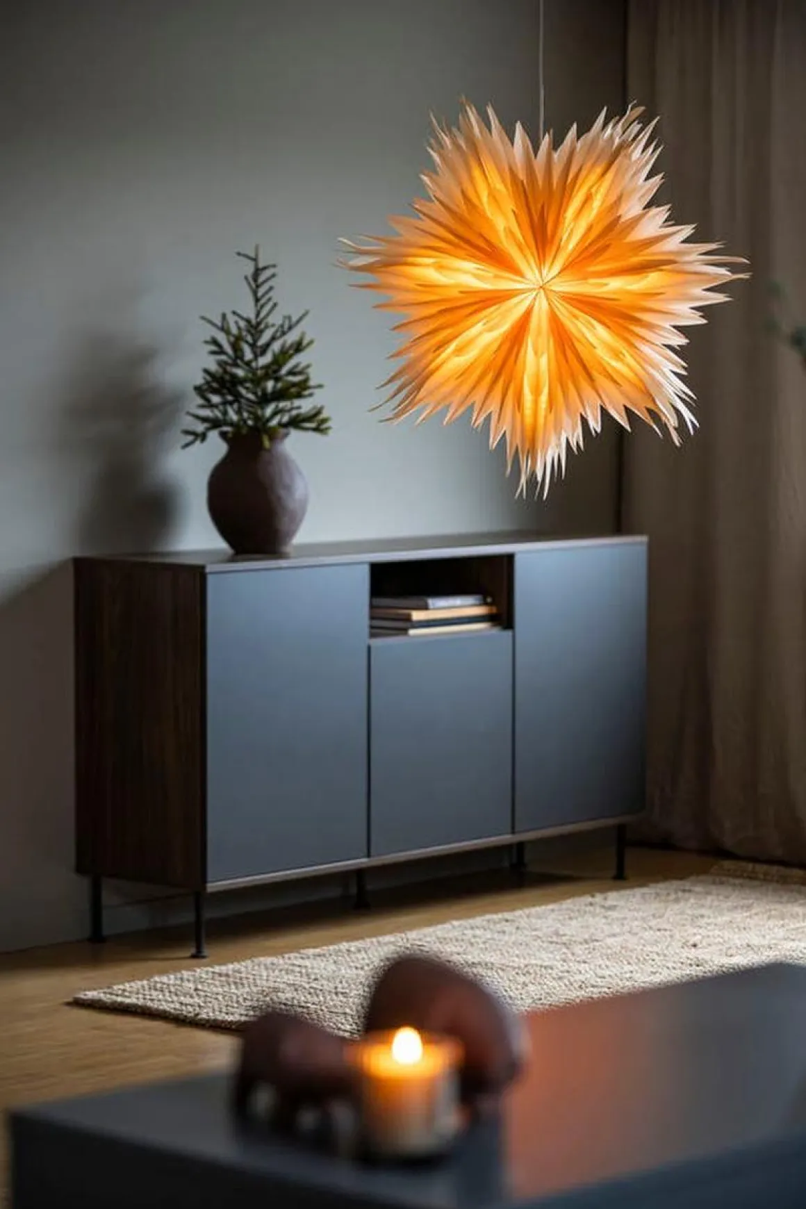 Imponerende adventsstjerne i gyllent papir med elegant perlemoreffekt. Med praktisk snorhenger og hvit snor med bryter – en tidløs klassiker som skaper en varm, koselig og hjemmekoselig julestemning.