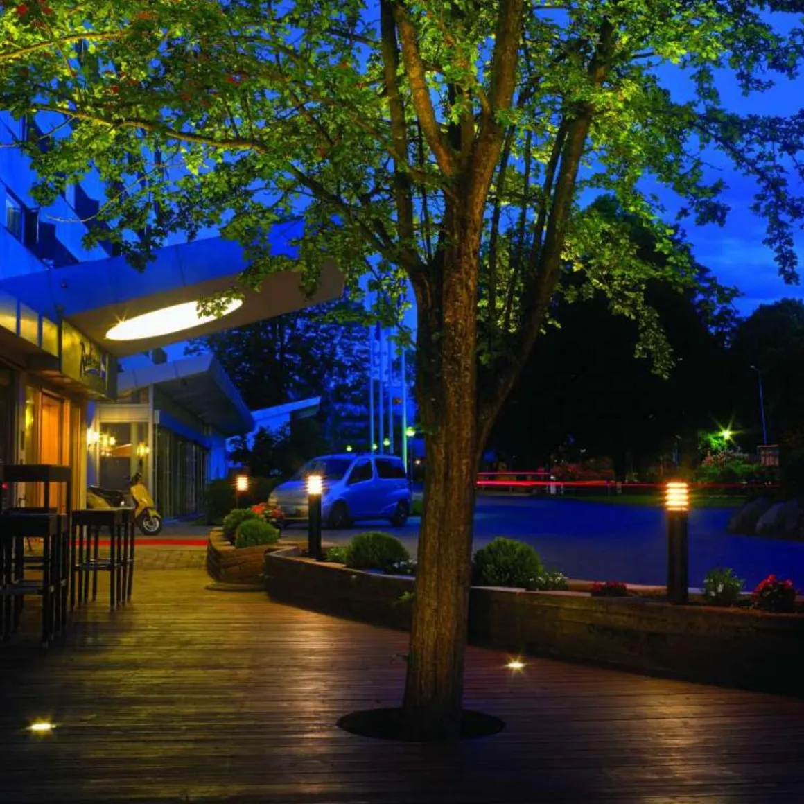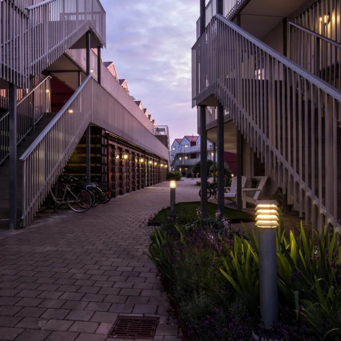 Alta-pullert i moderne design med lys som lyser nedover. Pullerten har opalhvit glasskuppel i polykarbonat, som gir et jevnt og behagelig lys.