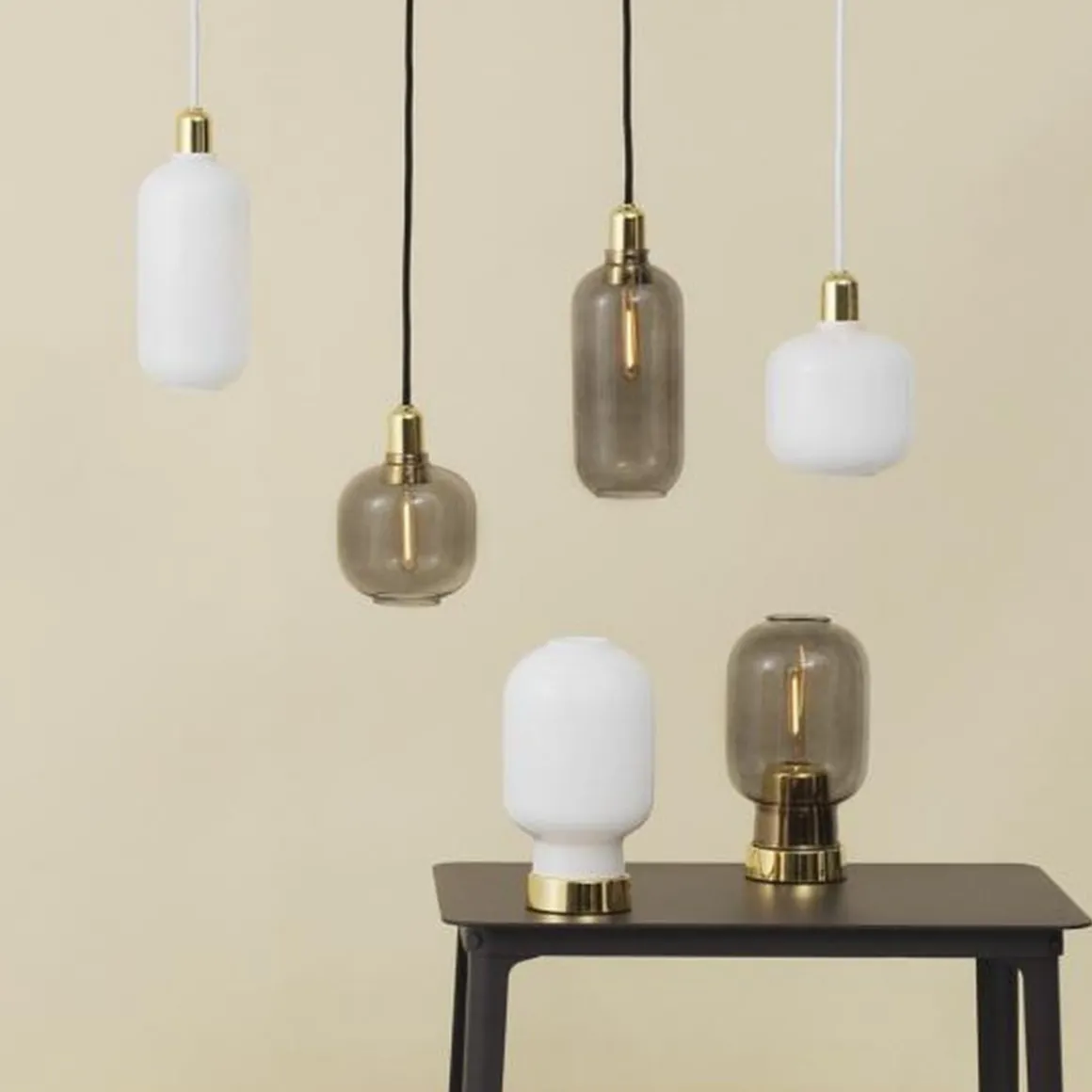 Amp Lamp S fra Normann Copenhagen er en nydelig pendel, og nå har den endelig kommet i ny versjon med røkfarget glass og messingdetaljer. Rålekker alene og i kombinasjon med Amp Lamp L, da gjerne i forskjellige høyder. Leveres med 4m tekstilkabel. Lyskilde ikke inkludert.