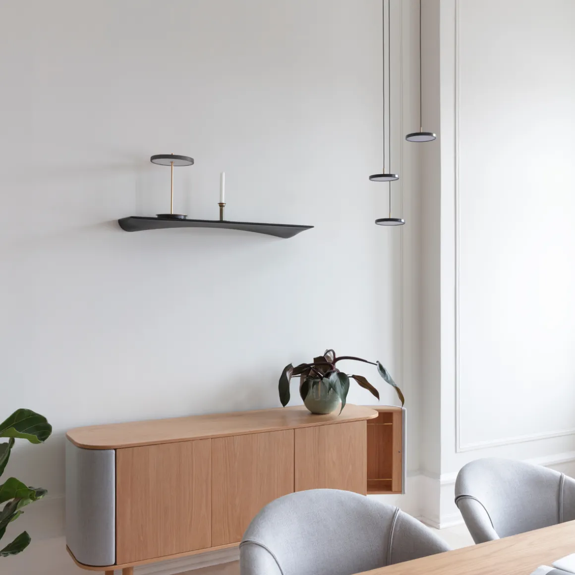 Asteria Micro Cluster er en baldakin som gir deg muligheten til å henge tre Asteria Micro-pendler i klynger. For et klyngeutseende er det bare å bytte ut de medfølgende Asteria-mikrokalesjene for Asteria Micro Cluster-kalesjen.
