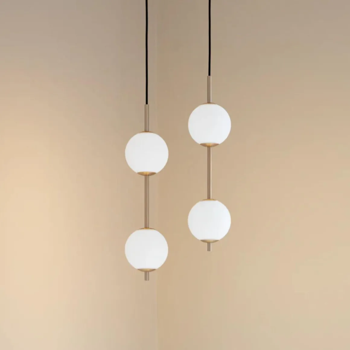 Med messingdetaljer og munnblåste opalglasskuler, utstråler Audrey en fortryllende varme som minner om lysende perler. Lampen kan dimmes med en ekstern dimmer, og de delikate kuplene sprer et behagelig lys som skaper en avslappende atmosfære.