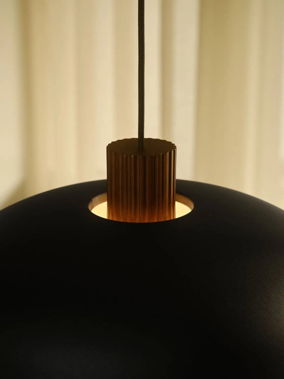 Denne elegante pendellampen fra designerne Bjørn + Balle har et organisk og minimalistisk design, som er utført i ru metall med en riflet mørk tretopp. Lyset skinner gjennom åpningen på toppen av skjermen og skaper en vakker lyseffekt. Perfekt over spisebordet eller kjøkkenbordet.