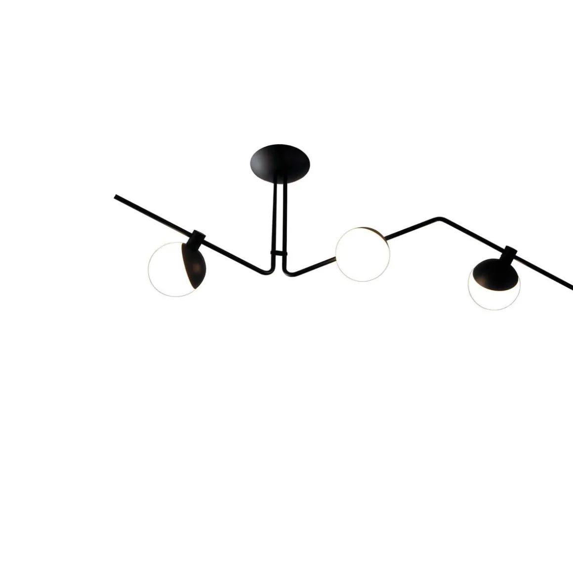 Denne moderne designer taklampen passer inn i ethvert hjem og gir stil til innredningen. Den har tre runde opalglass på de to armene og de sprer et behagelig jevnt lys i rommet.