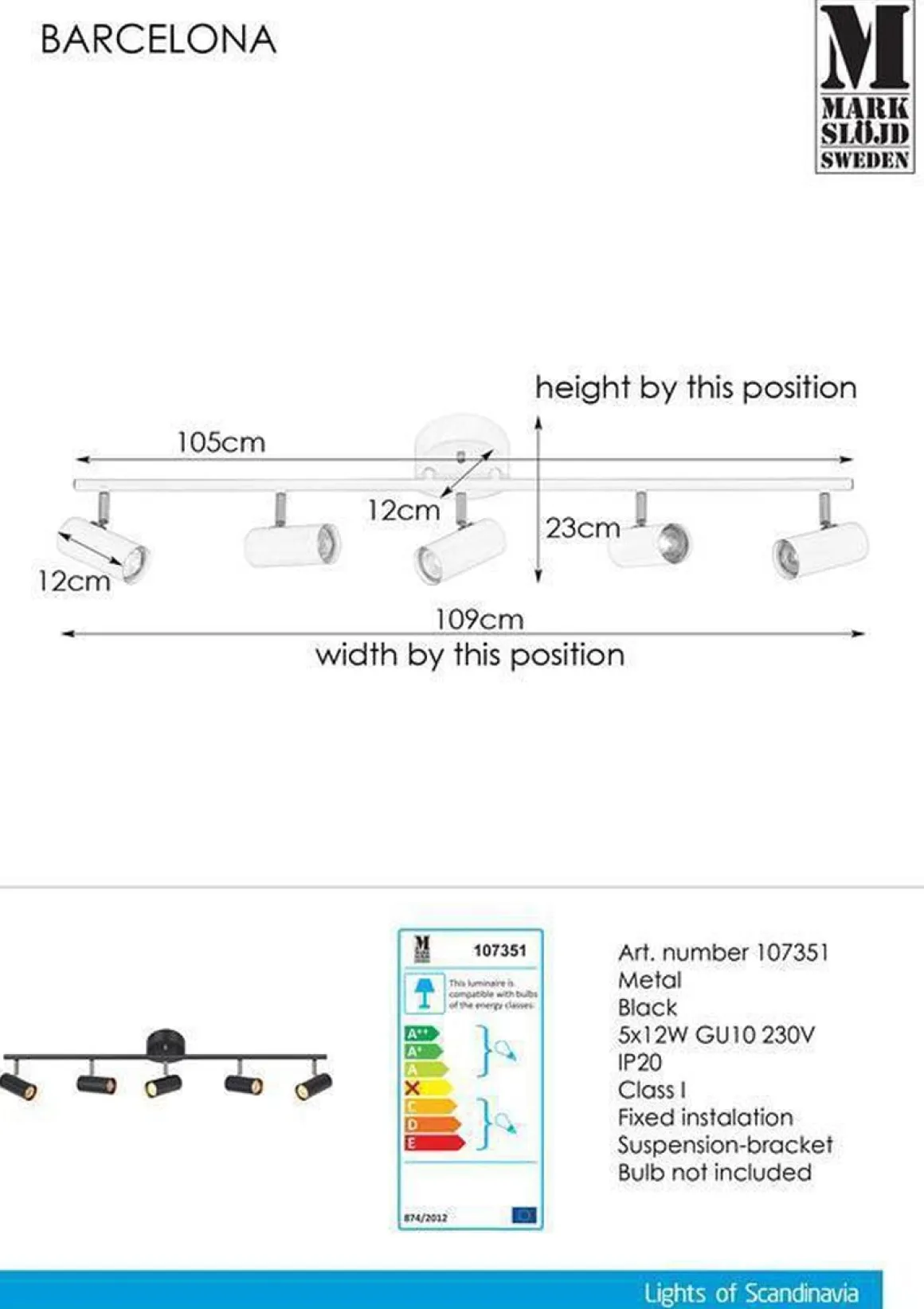 Barcelona-spottskinne er en enkel og moderne taklampe med 5 justerbare lampehoder, fra Markslöjd. Du behøver 5 stk lyspærer med GU10-sokkel til lampen.