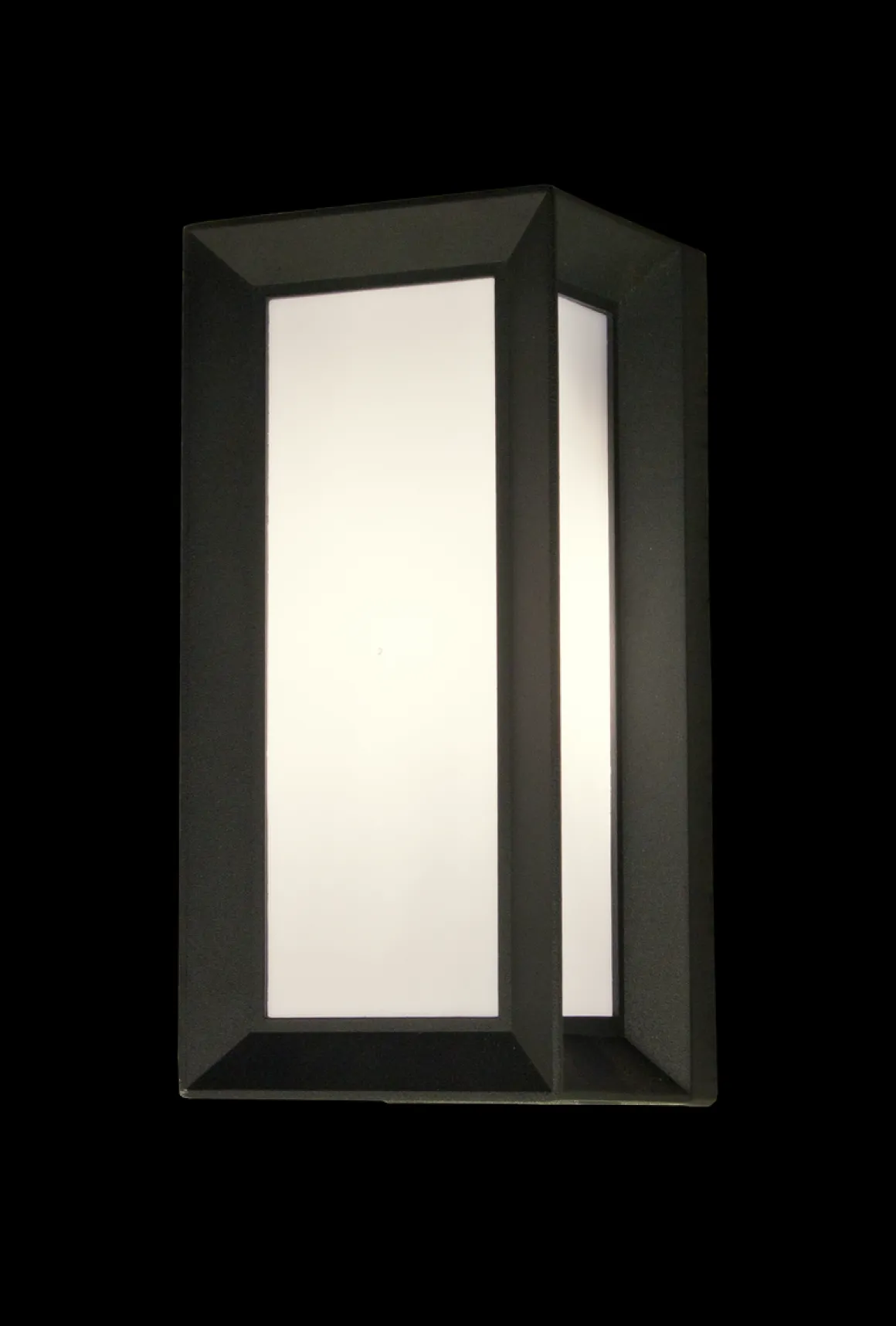 Box utelampe for montering på husets fasade i svart aluminium og opalhvit skjerm i akryl. 40W max wattstyrke og lyskilde er ikke inkludert. Strømtilkobling for fast montering. IP44