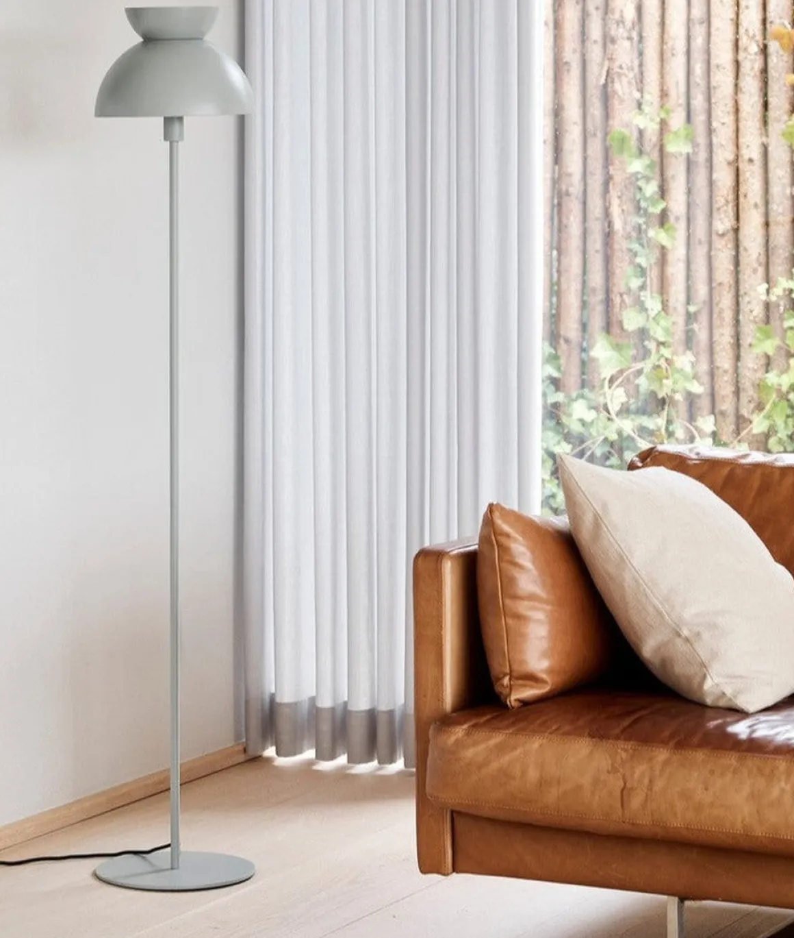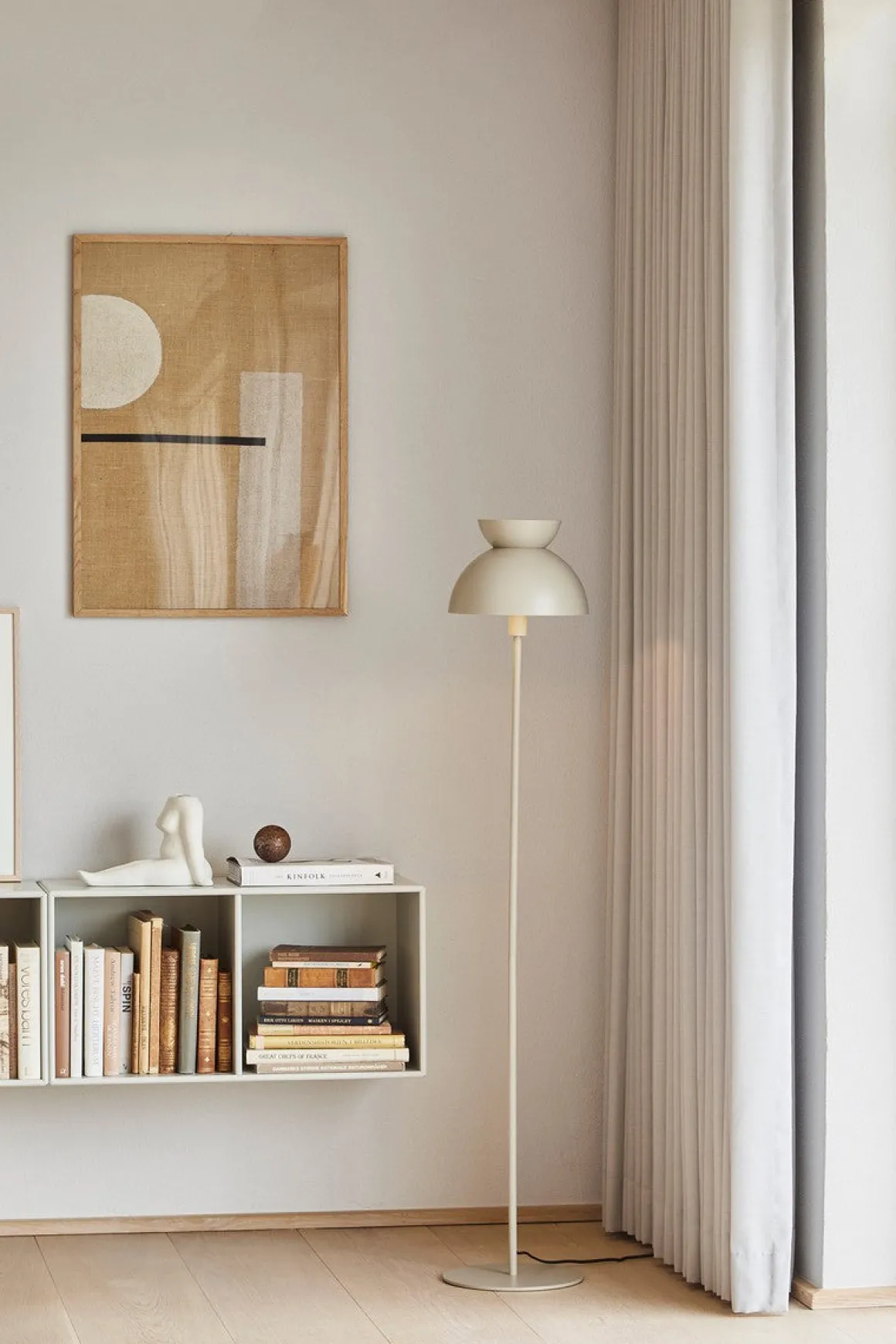 Butterfly gulvlampe fra Frandsen består av tre halve kupler presentert på omvendte måter. De sfæriske formene på de halve kuplene skaper et samspill mellom lampens runde linjer. Toppkuppelen er utstyrt med diskrete hull for å få det myke lyset til å spre seg oppover.