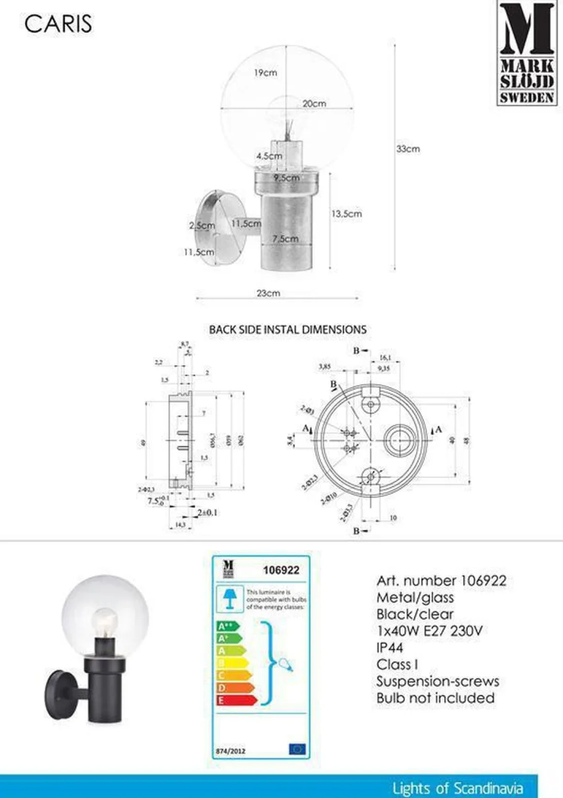 Caris er en lekker og tidløs vegglampe til utendørsbruk. Lampen er i pulverlakkert rustfritt metall.
