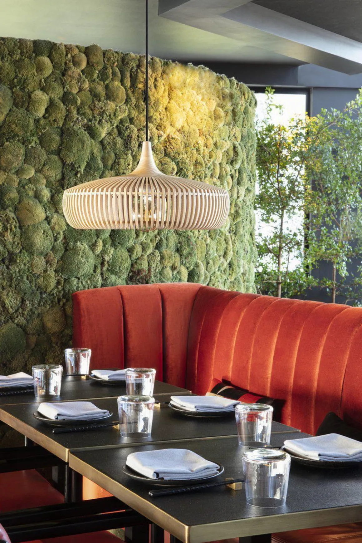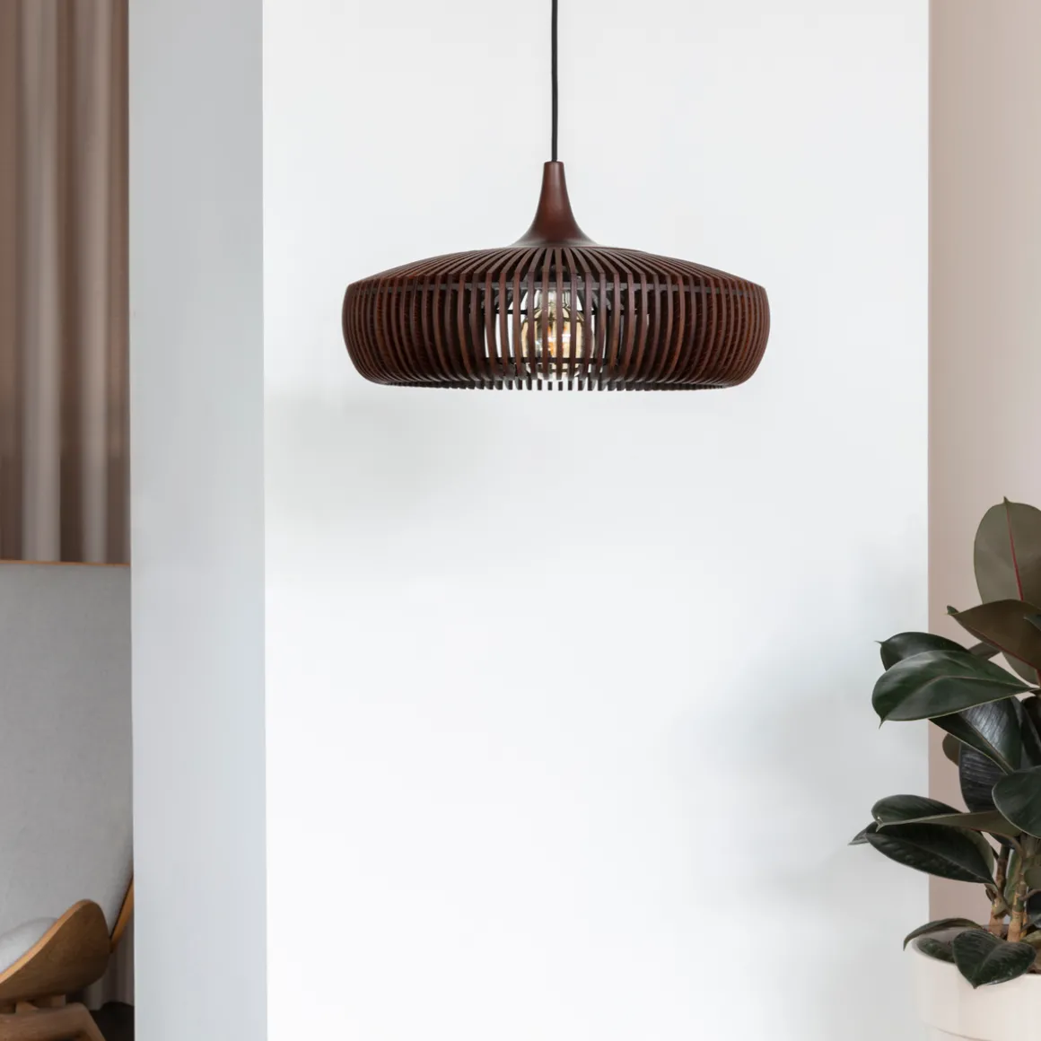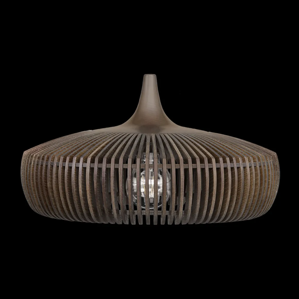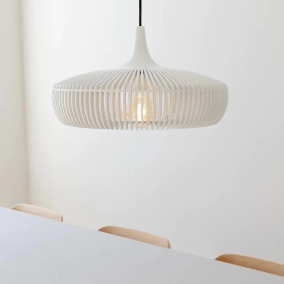 Clava Dine Wood-lampeskjermen er designet av en håndverksteknikk som krever en unik presisjon og nøyaktighet på grunn av den lille avstanden mellom hver lamell. Tre lamellene er laget av laserskåret ask og finér av eik med solid eik. Lampeskjermen skiller seg ut som et skulpturert designverk som skaper en lekende lysglimt på veggene i det omkringliggende rommet. Lampehettenes troskap skaper et vakkert mønster som kan beundres fra alle vinkler, både på innsiden og på utsiden av lampeskjermen.