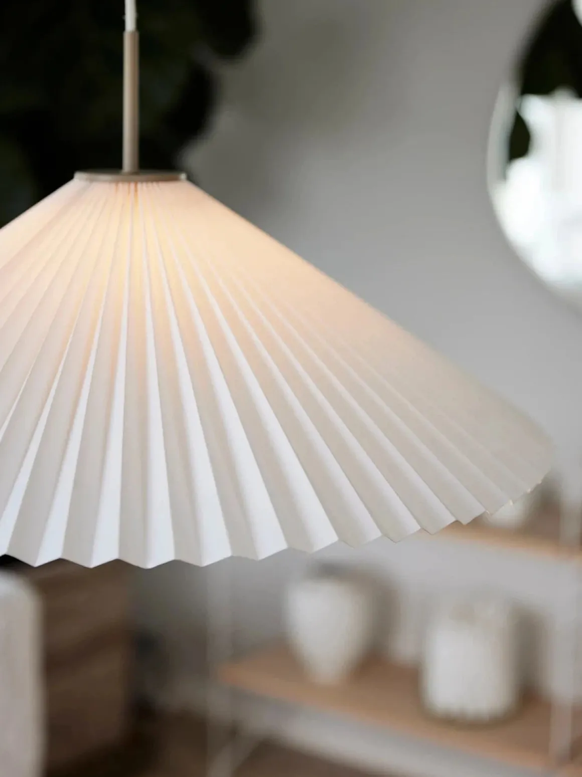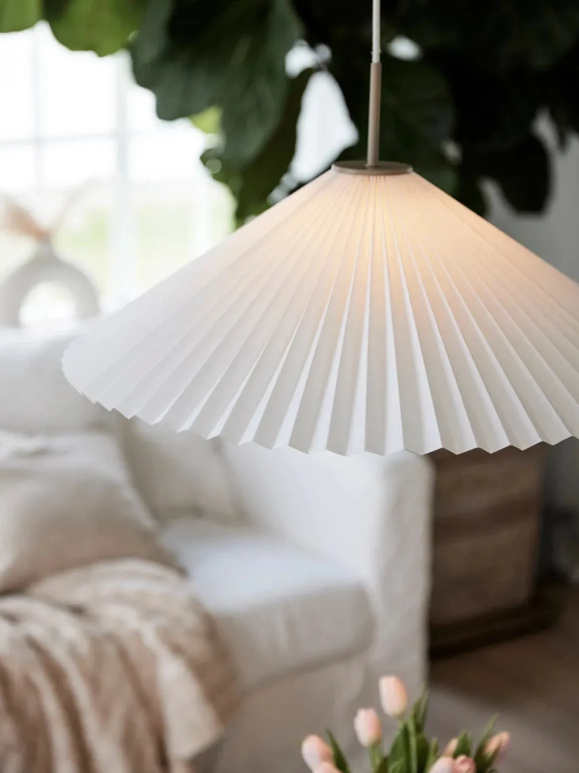 Taklampe Dora med 2m hvit tekstilkabel og lampeskjermen er laget av hvitt papir. Takkopp og lampeholder i beigelakkert metall. Lampen leveres med 1 stk E27 lampeholder, klargjort for ujordet tilkobling og krokoppheng til eksisterende takkontakt. Lampeskjermen er 60 cm i diameter. Lyskilde og takkontakt medfølger ikke.