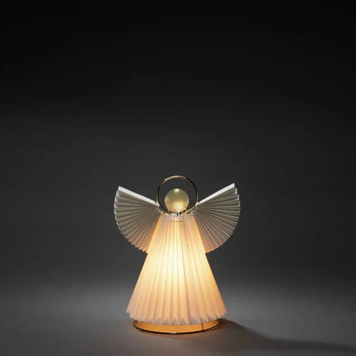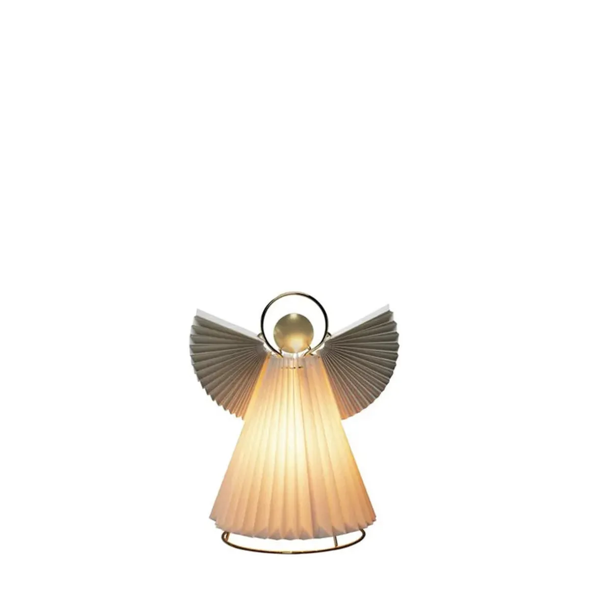 Engel i papp og messing. 26 cm høy. E14 lampeholder og ledning med bryter.
