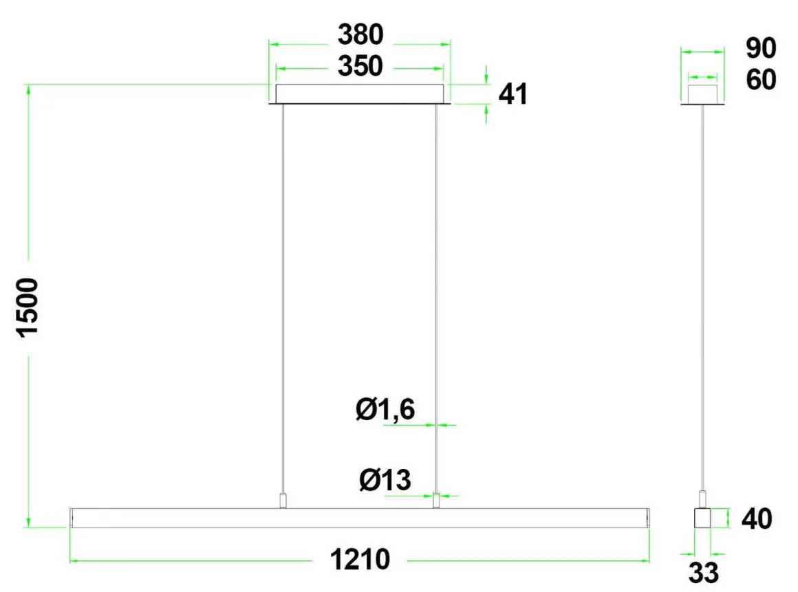 - Lengde ledning: 150 cm fra takfeste ned til pendel