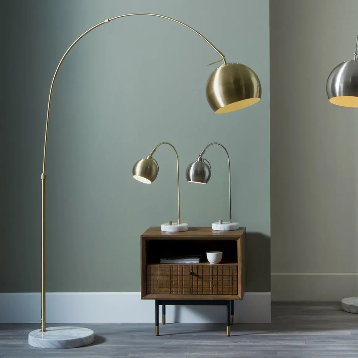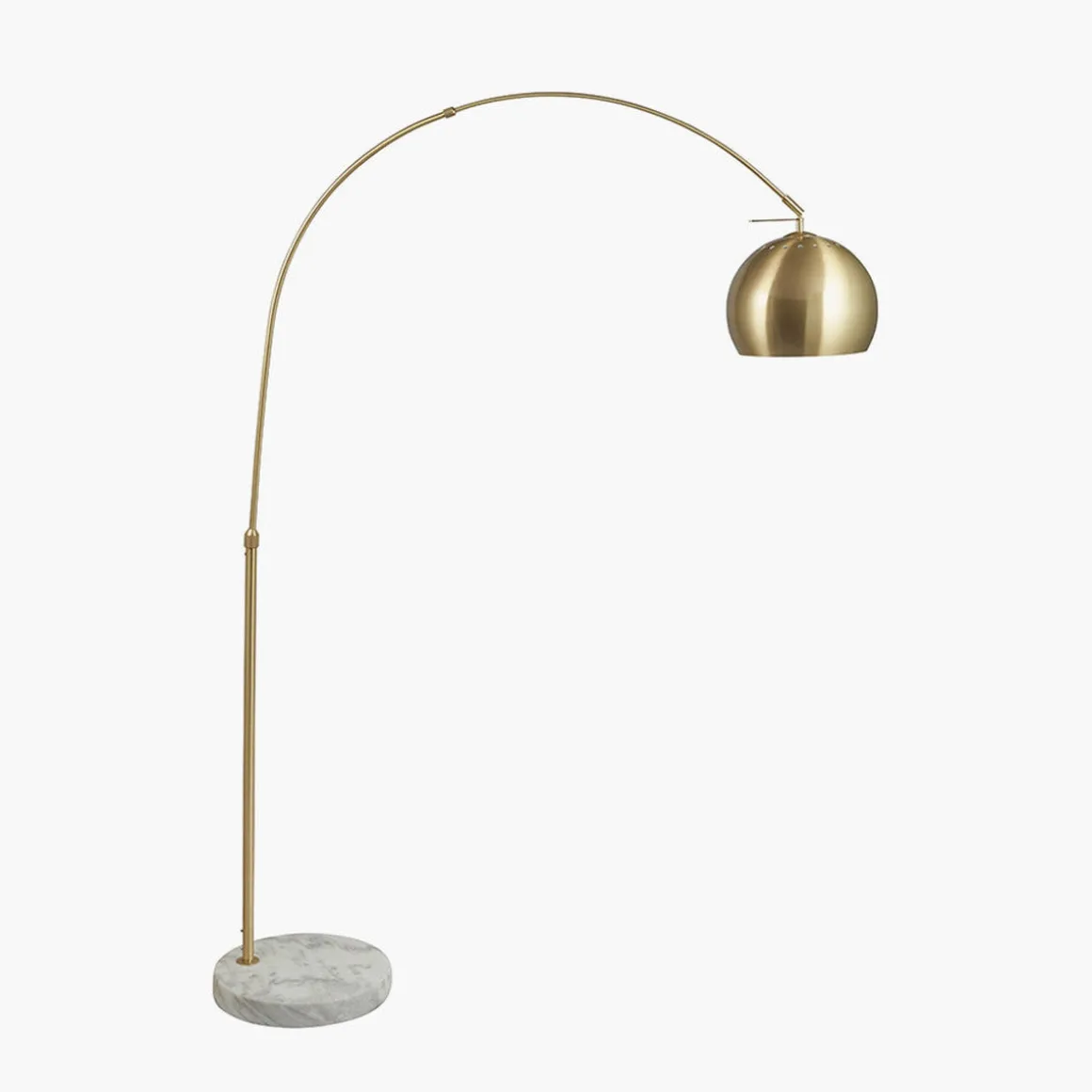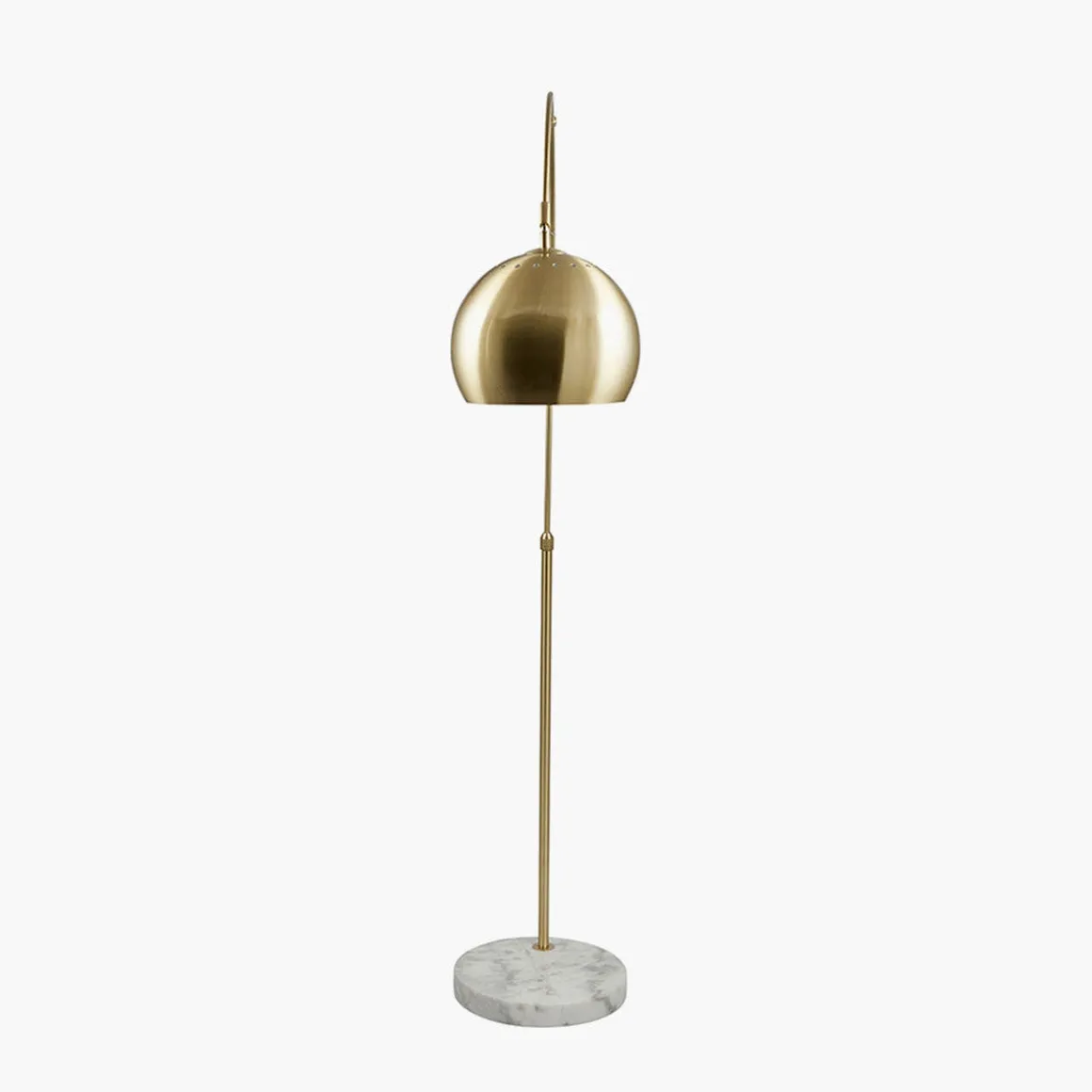 Gulvlampe i metall med fot i hvit marmor. Leveres i satin og i børstet messing. finnes også som bordlampe i samme modell.