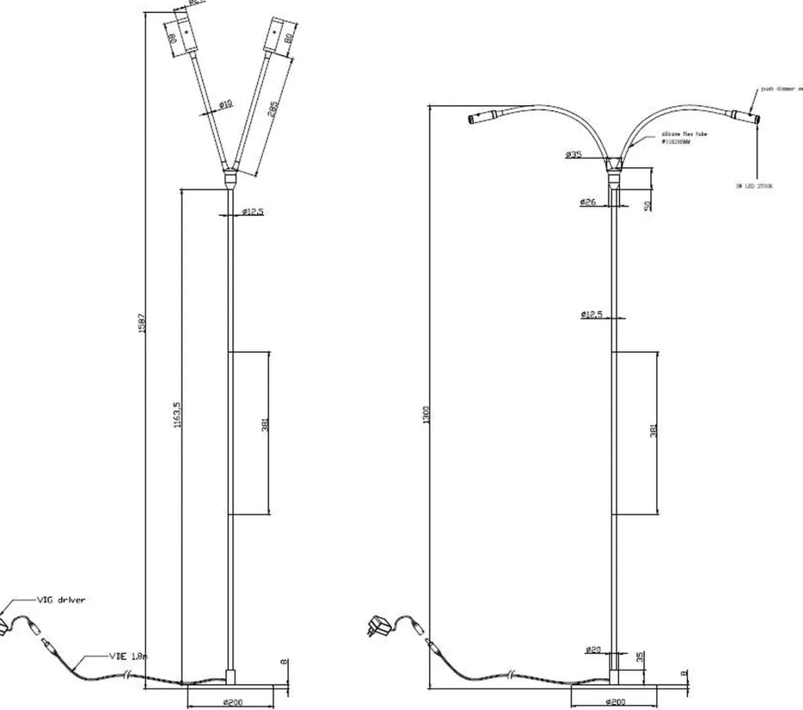 Gulvlampe med to lys. Begge lysene har individuelle push-dimmere på lampehodet. Armene er fleksible og kan bøtes i alle retninger.