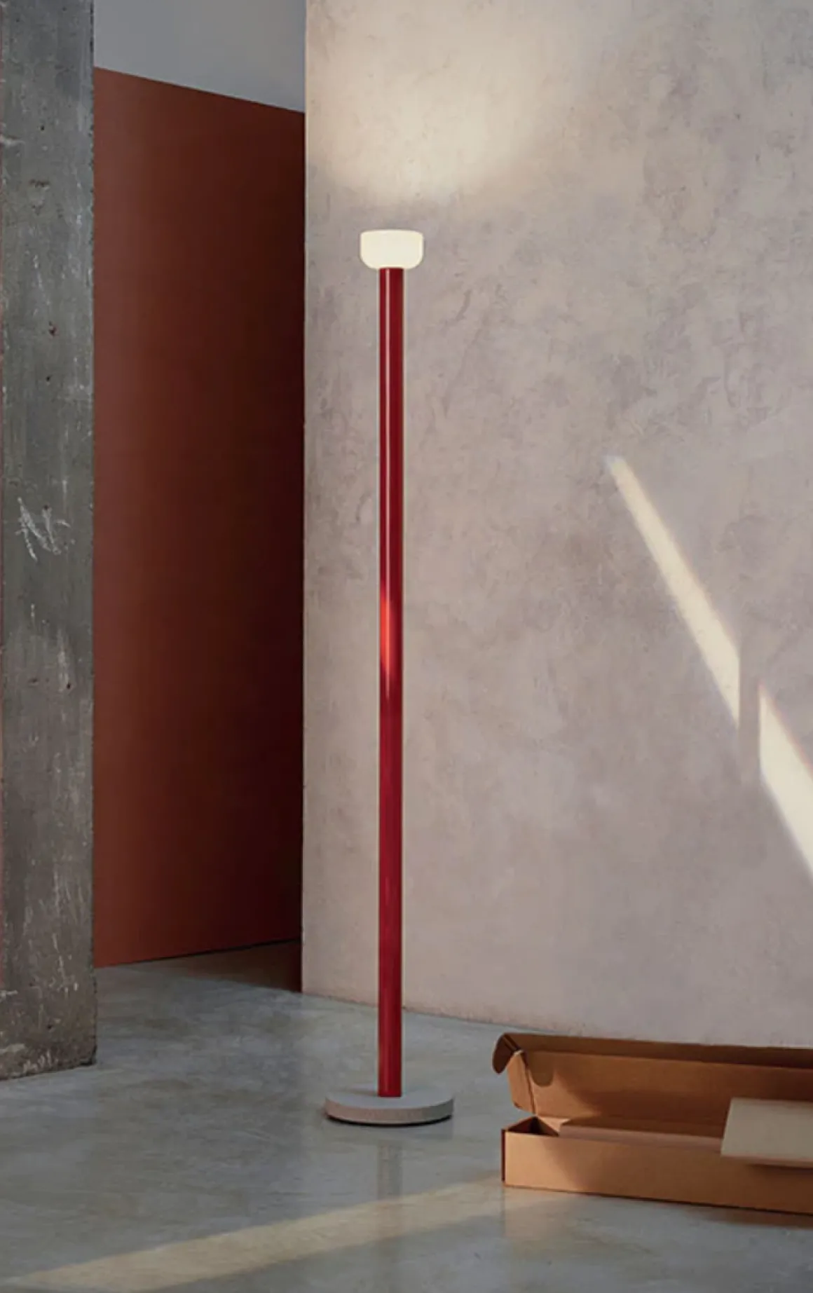 Gulvlampe med indirekte lys. Stamme i malt aluminium, kommer i fargene: skinnende hvit, rød , cioko eller grønn. Reflektor i blankt opalt hvitt og grått blåst glass. Lampen har ledning på 2,7meter med fotdimmerbryter for PÅ / AV-funksjon og lysstyrkejustering 10–100%.