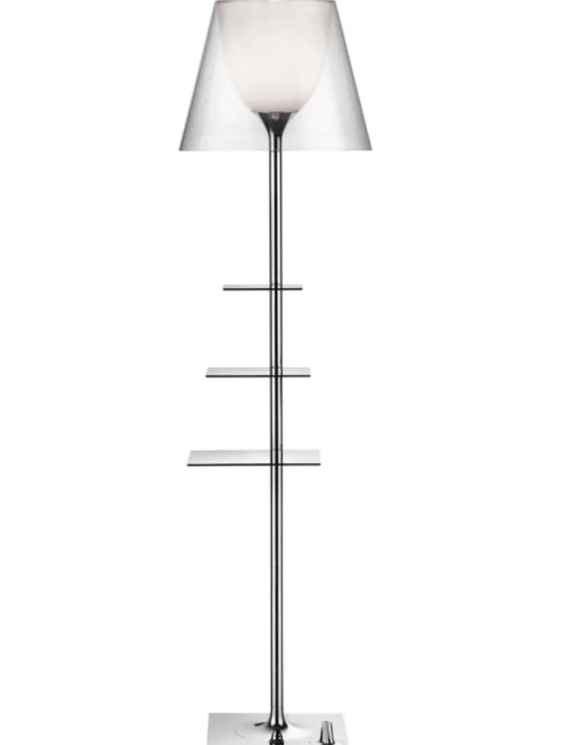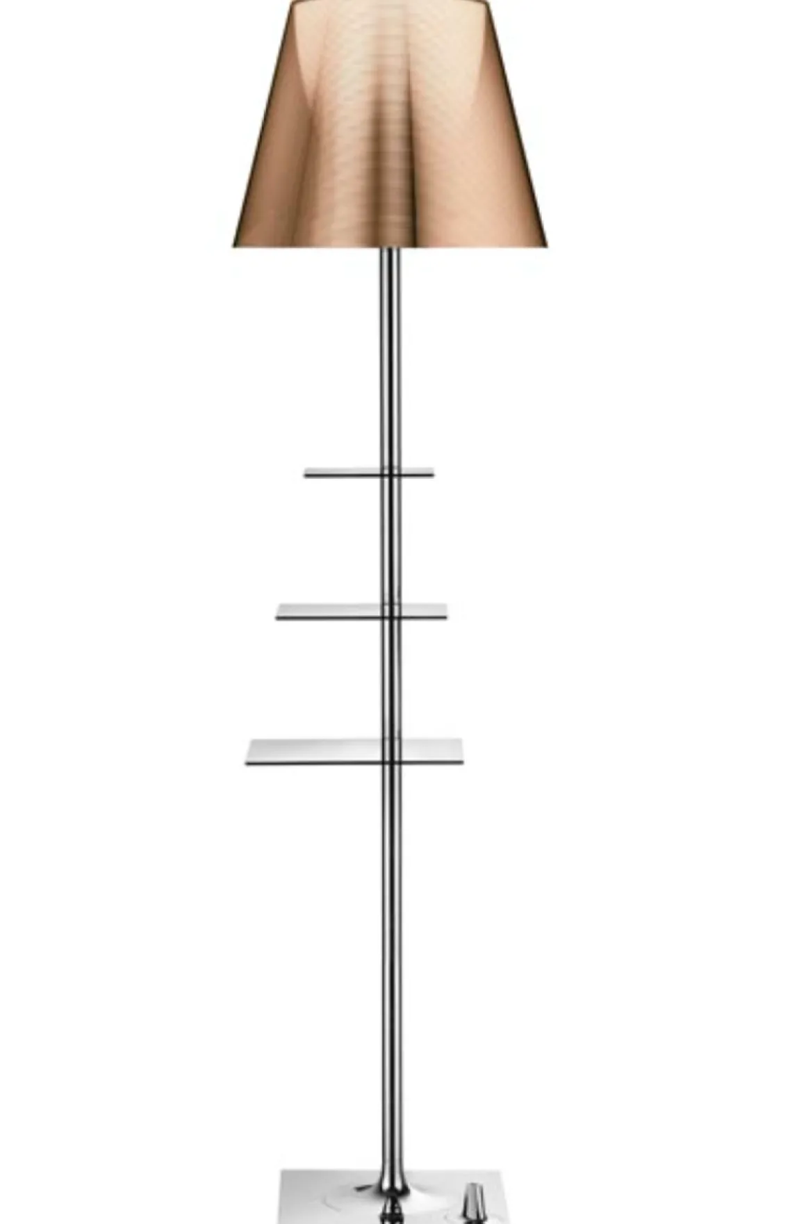 Bibliotheque Nationale gulvlampe med røkfarget skjerm er designet av Philippe Starck i 2013. Det er en elegant og stilsikker gulvampe hvor en kan ha mye lys i uten å bli blendet, da lyskilden ligger godt skjult inni en kuppel. Hele 150 watt kan man ha i denne, og hyllene til å ha bøker o.l på er bevegelige. I tillegg finner du en smart USB-tilkobling på foten av lampen. Den er også dimbar for stemningslys når man ønsker det.