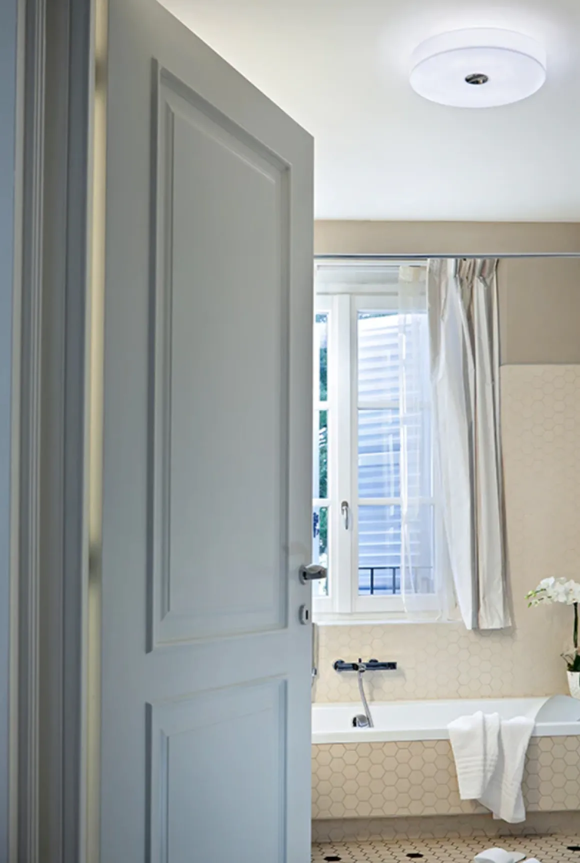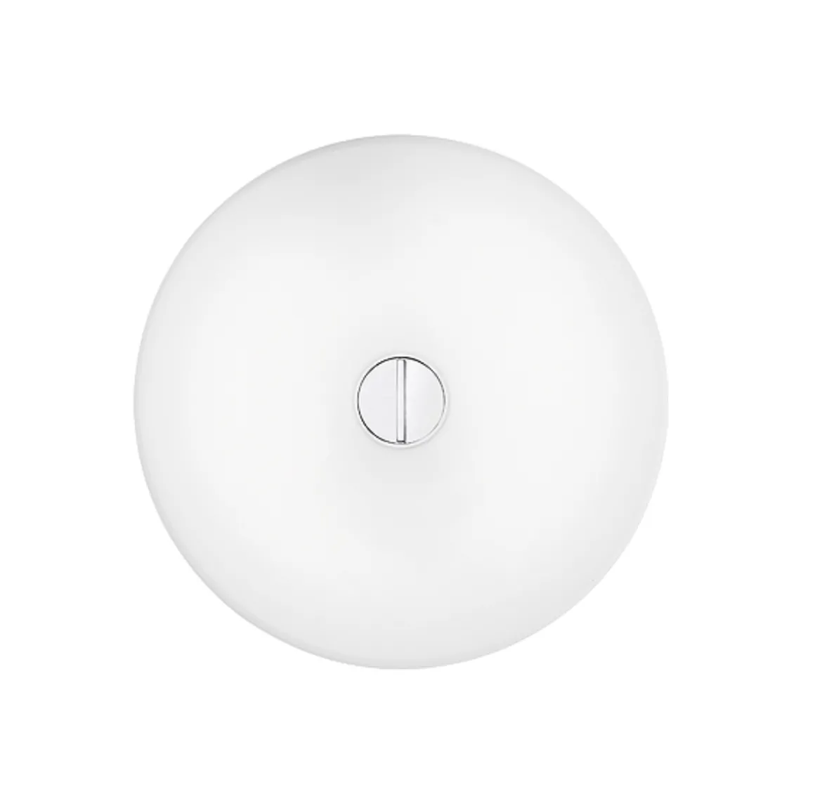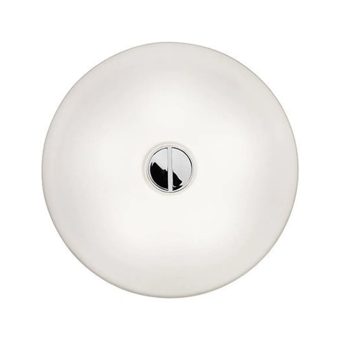 Button tak/vegglampe i glass fra italienske Flos. Denne stilrene lampen gir godt med lys og er fin å dimme. Den kan festes både i tak og på vegg, og den har Ip40 slik at den også kan brukes på baderom. Glasset er munnblåst og det er detaljer i stål og blank krom. Designet av Piero Lissono i 2004