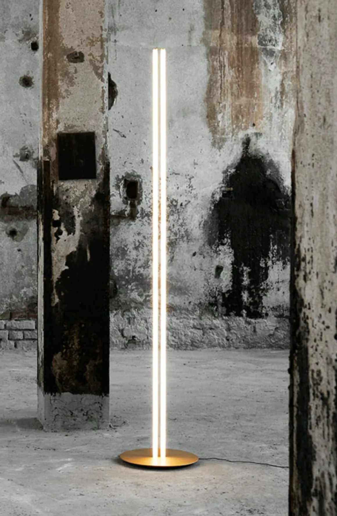 Coordinates gulvlampe med diffust lys består av to vertikale stolper som kan orienteres under installasjonen, festet til en base med et anodisert aluminiumsdeksel. Hvert element er laget av ekstrudert anodisert aluminium med en champagnefinish og en diffusor i platina optisk silikon med en integrert LED-stripe (CRI 95).