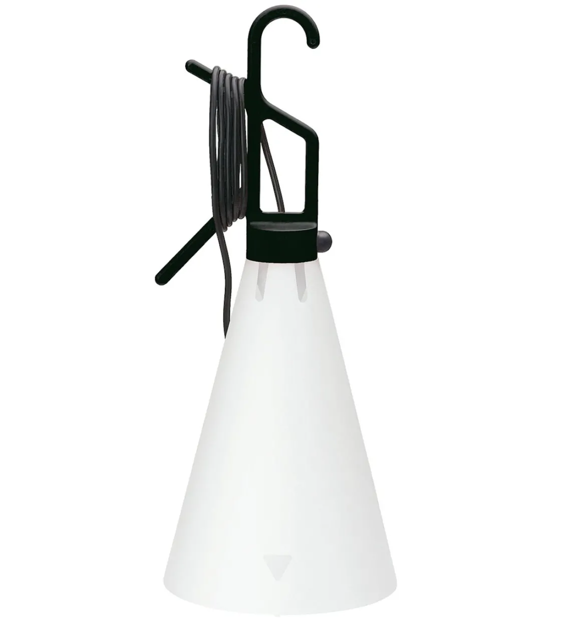 May Day er en smart, kreativ og multifunksjonell lampe som kan brukes på flere måter. Med innebygget krok kan den enkelt henges opp i taket, på en stang, settes på et bord eller la stå på gulvet. Den lange ledningen på nesten 5 meter kan surres rundt to hanker øverst på lampen – smart og gjennomtenkt. Lampen vil gi et generelt lys uten å blende, men vil også gi lys ned i bordflaten om den skulle henge over et spisebord. Lampen fungere fint som bordlampe da det er bryter på håndtaket. Finnes i flere farger. Designet av Konstantin Grcic, 2000