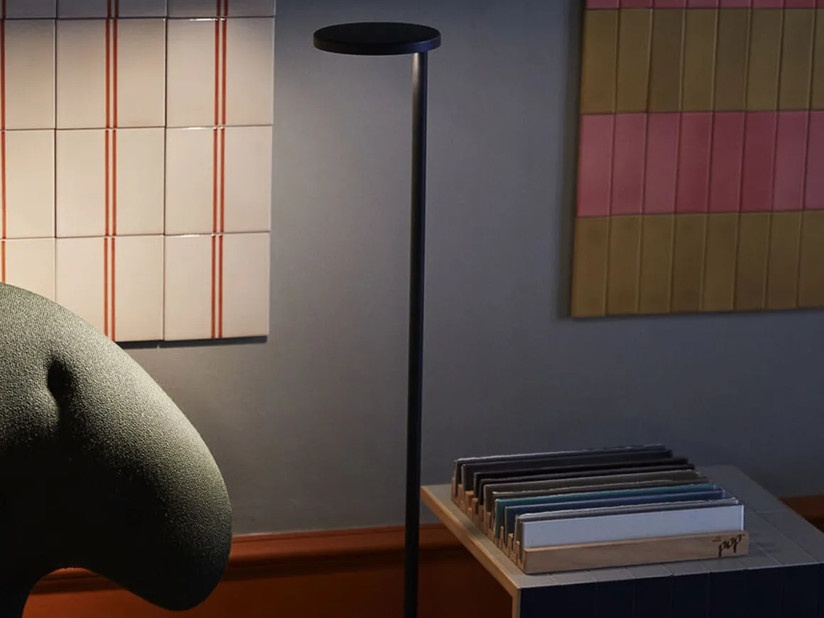 Lampens LED-lyskilde er skjult, noe som skaper et visuelt behagelig lys. Oblique Floor har en av/på-dimmer som er integrert i lampehodet. Velg mellom flere farger.