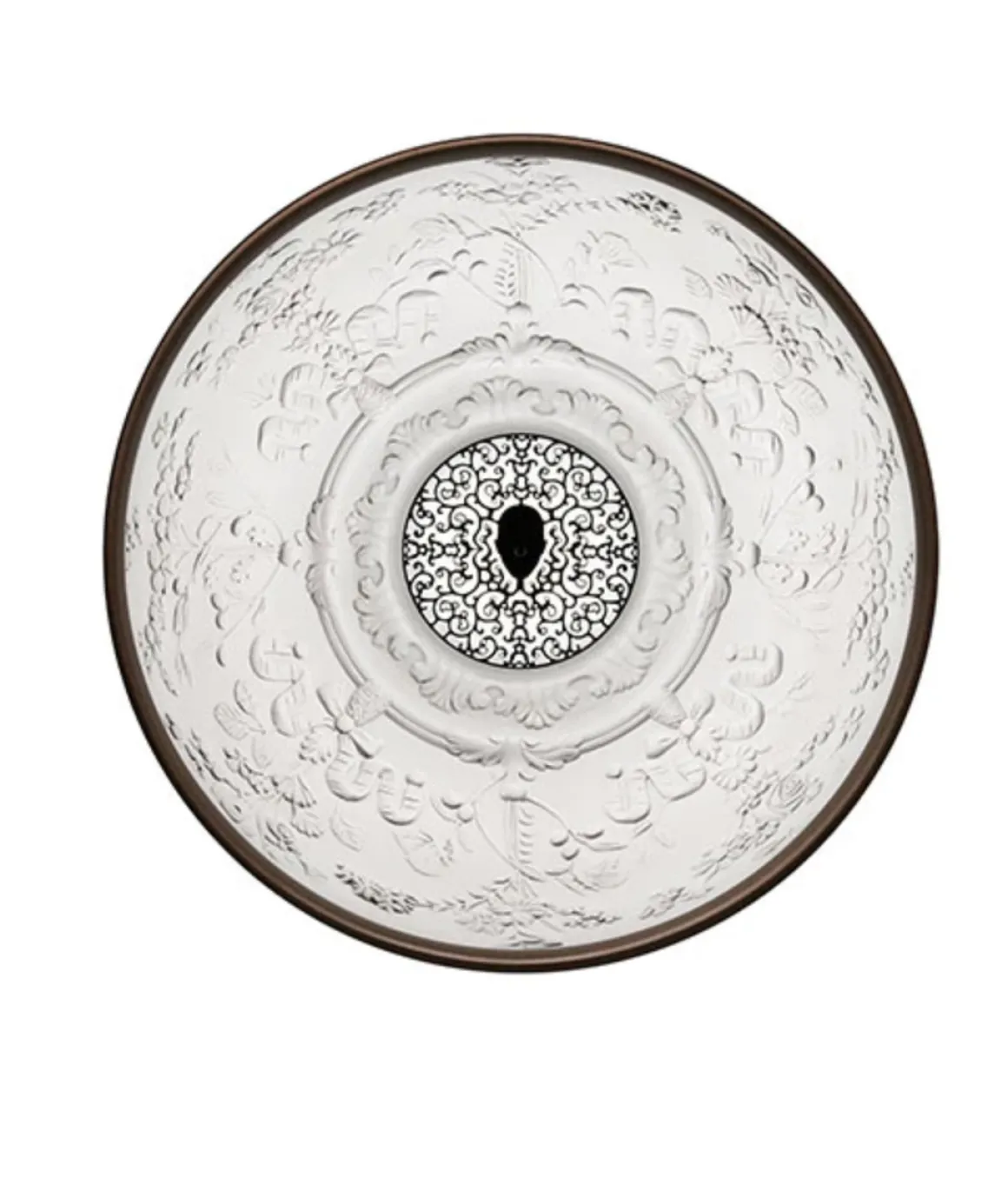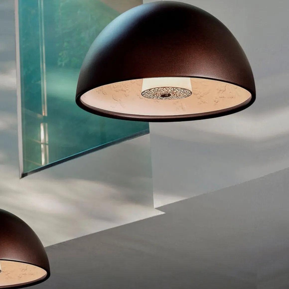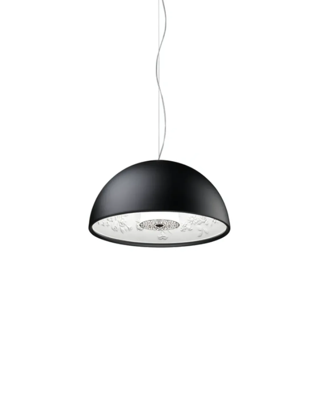 Denne tilsynelatende stilrene lampen med sin enkle kuppelform, skjuler en langt mer finurlig formet innside. Den vakre stukkaturen på innsiden lever godt opp til navnet sitt; Skygarden, og det var nemlig et slikt originalt stukkatur i gammelt et tak som var inspirasjonen til denne lampen.