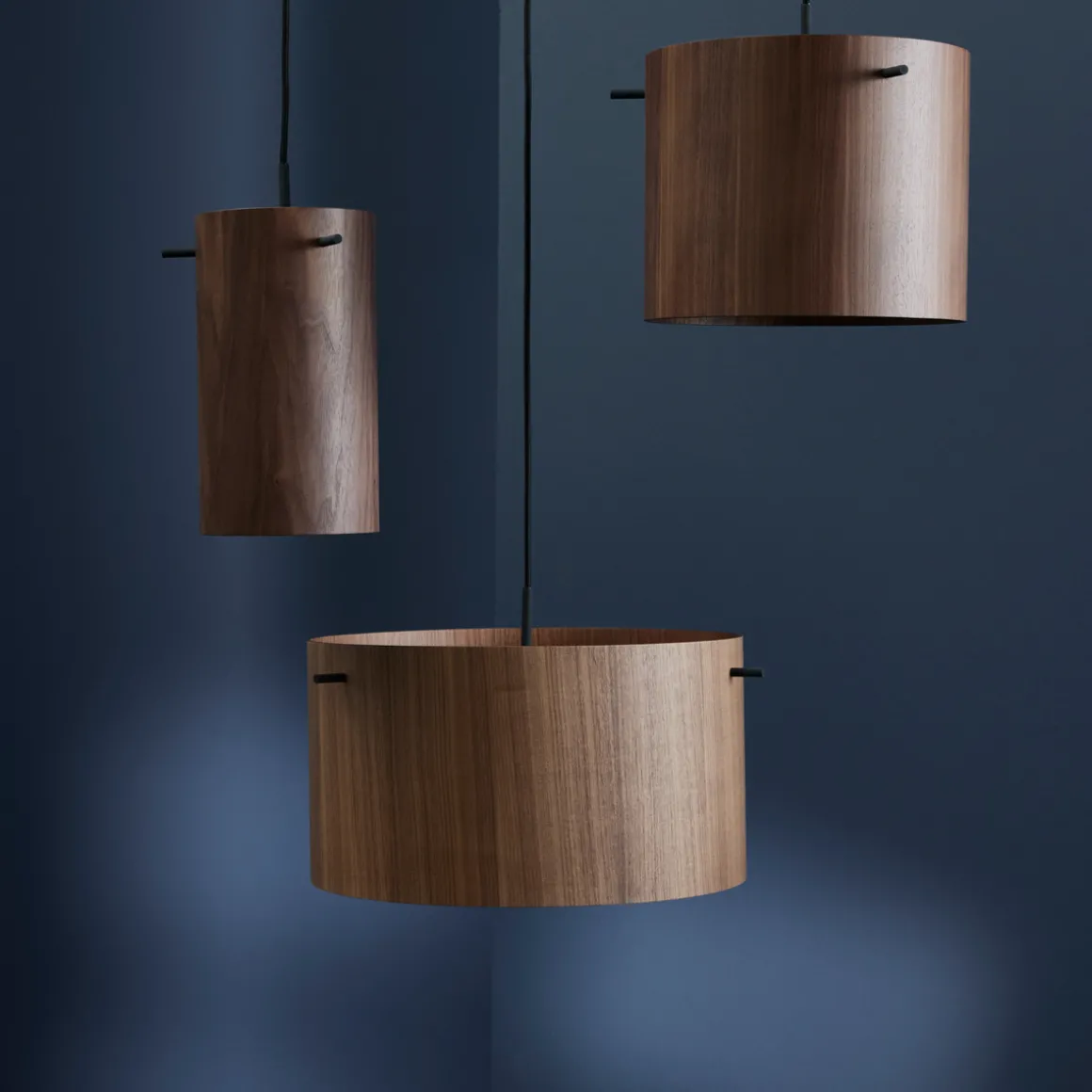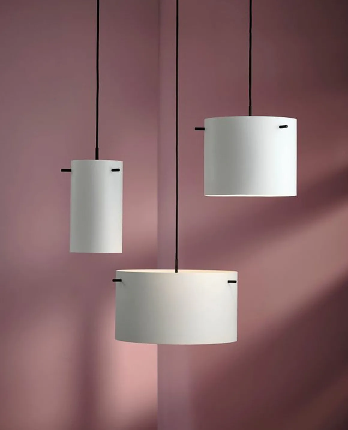 FM1954 Pendel er tilgjengelig i tre størrelser og tre farger – svart, hvit og grå/sand struktur. Leveres med en sort stoffledning og svart baldakin.