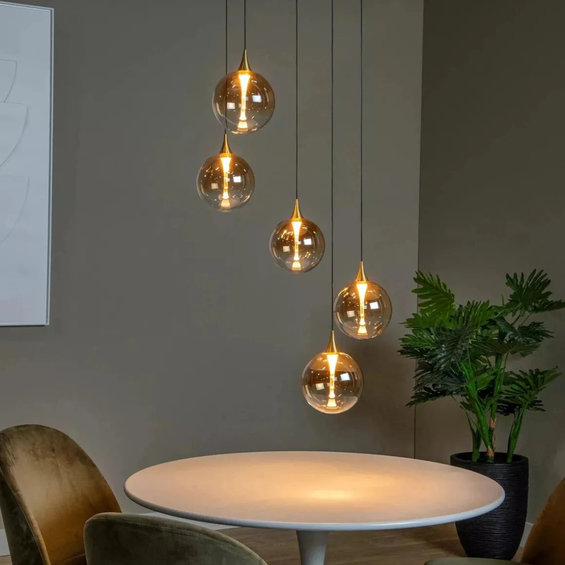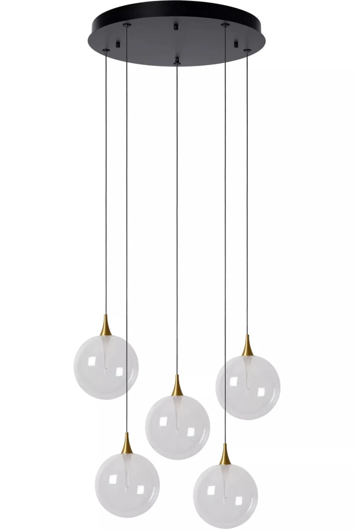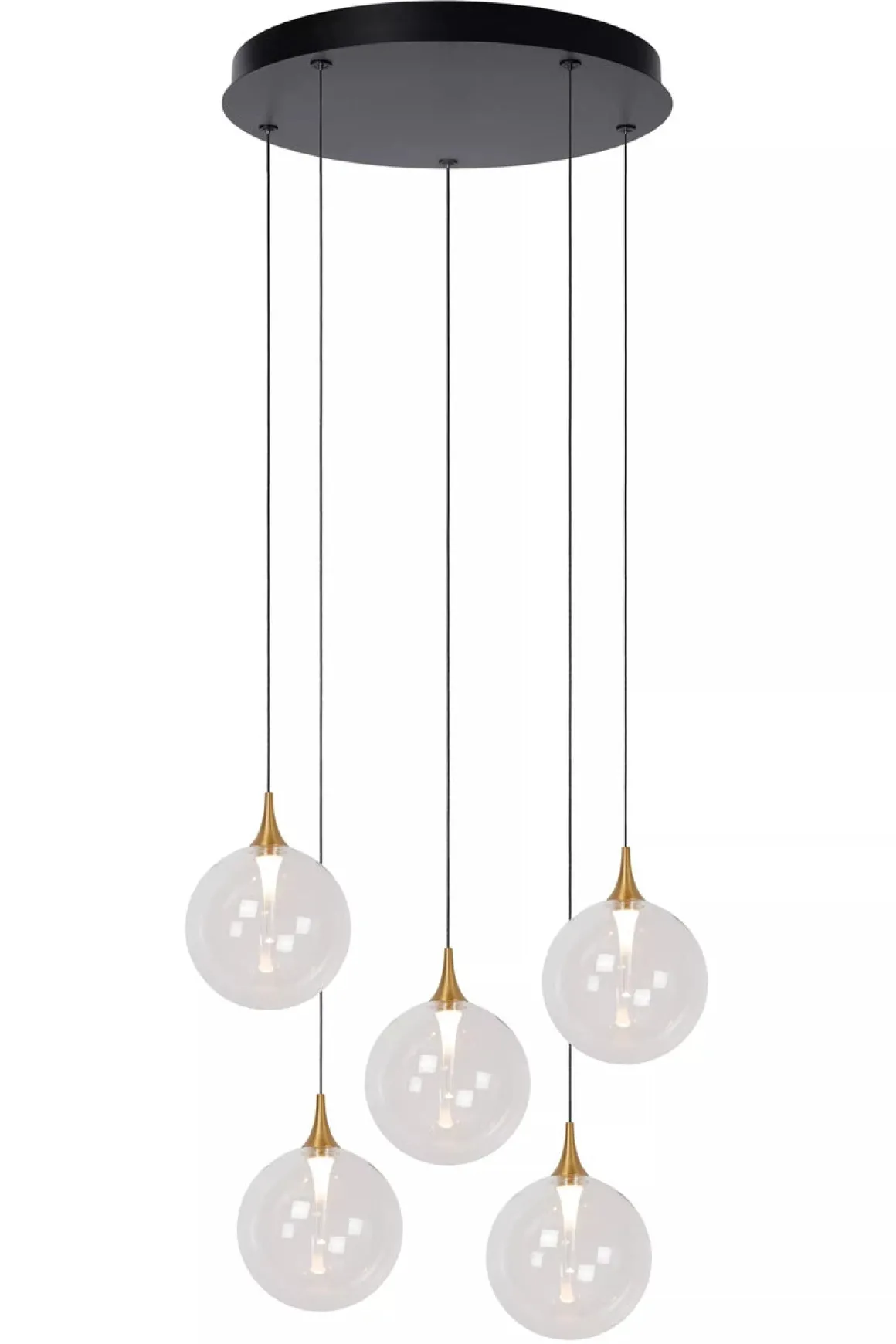 Synes du noen ganger det er vanskelig å holde alle ballene i luften? Overlat det til Gisela, en hengende lampe som består av forskjellige pendler med klare glasskuler, som hver kan justeres i høyden. De integrerte LED-pærene kan dimmes og sprer varmt, hvitt lys. Denne tidløse, sfæriske designen fungerer godt i både klassisk interiør og moderne hjem. Enten du henger dem i samme høyde eller lekende fallende: du vil alltid score med denne elegante hengende lampen.