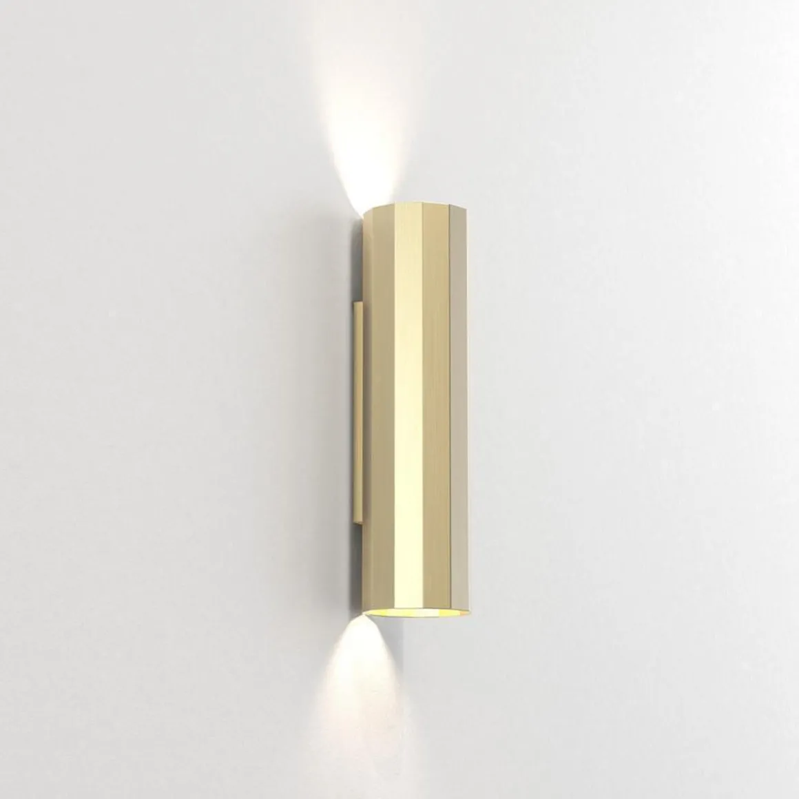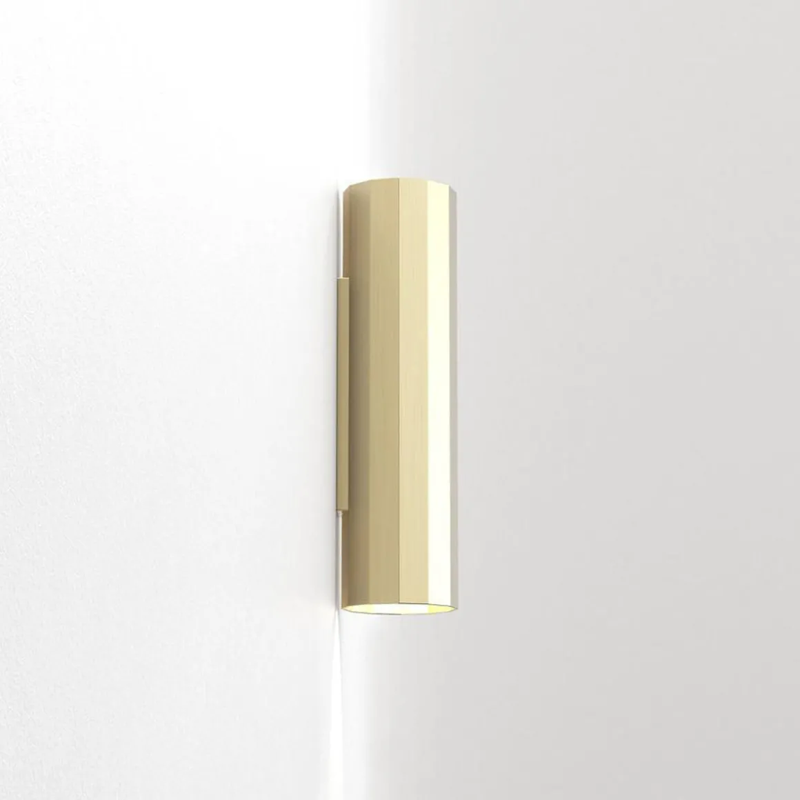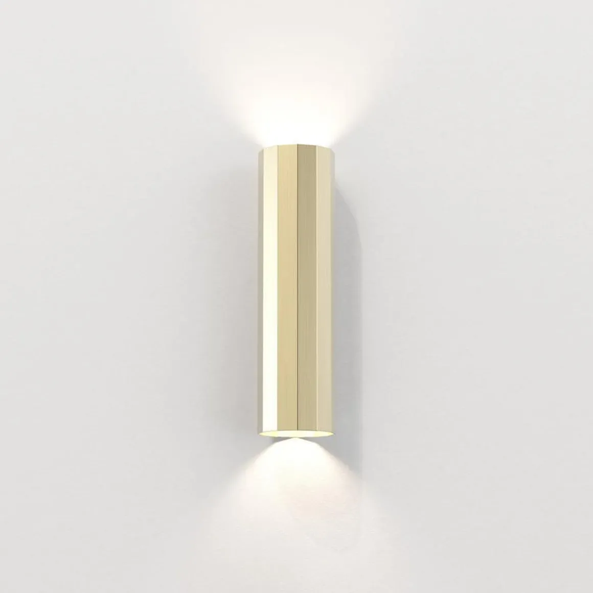 Vegglampen Hashira 300 er en moderne fasettert form inspirert av nyklassisk arkitektur. Den vasker definerte lysboller oppover og nedover, og kaster komplekse skygger som gjenspeiler formen. Den kommer i matt svart, matt nikkel eller matt gull og har ingen synlige fester for et sømløst utseende.