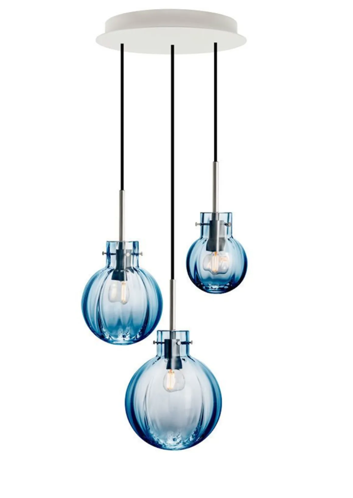 I denne kombinasjonen er det brukt følgende krystallkuler: Optikk stålblå 200 mm, optikk stålblå 160 mm og optikk stålblå 120 mm. Messingoppheng til 3 krystallkuler med sort tekstiltrukket kabel på 3 meter. Rund takbaldakin 34cm.