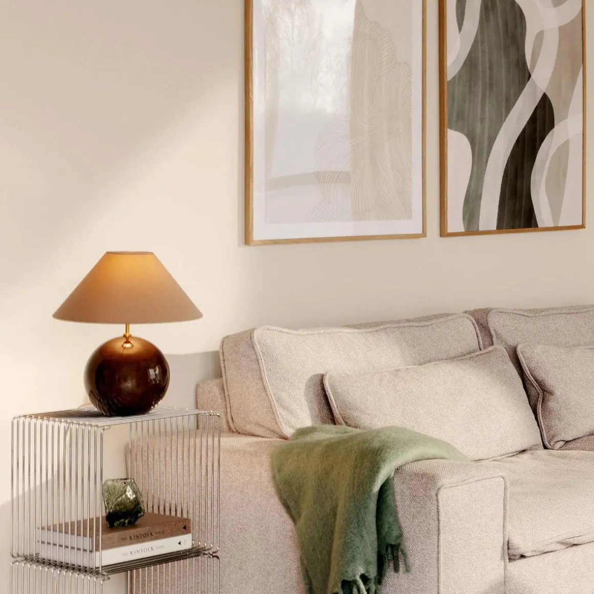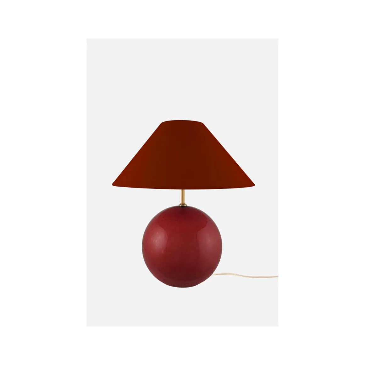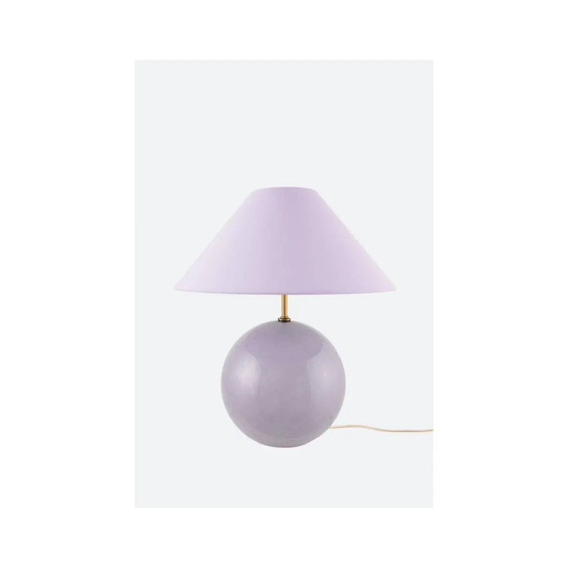 Ved å legge til noen moderne detaljer som lampefoten i farget glass, med detaljer som uregelmessige blåste bobler og en matchende lampeskjerm i bomull med dekket topp som går ton-i-ton med lampefot føles lampen som en naturlig interiørdetalj i mange moderne interiører.