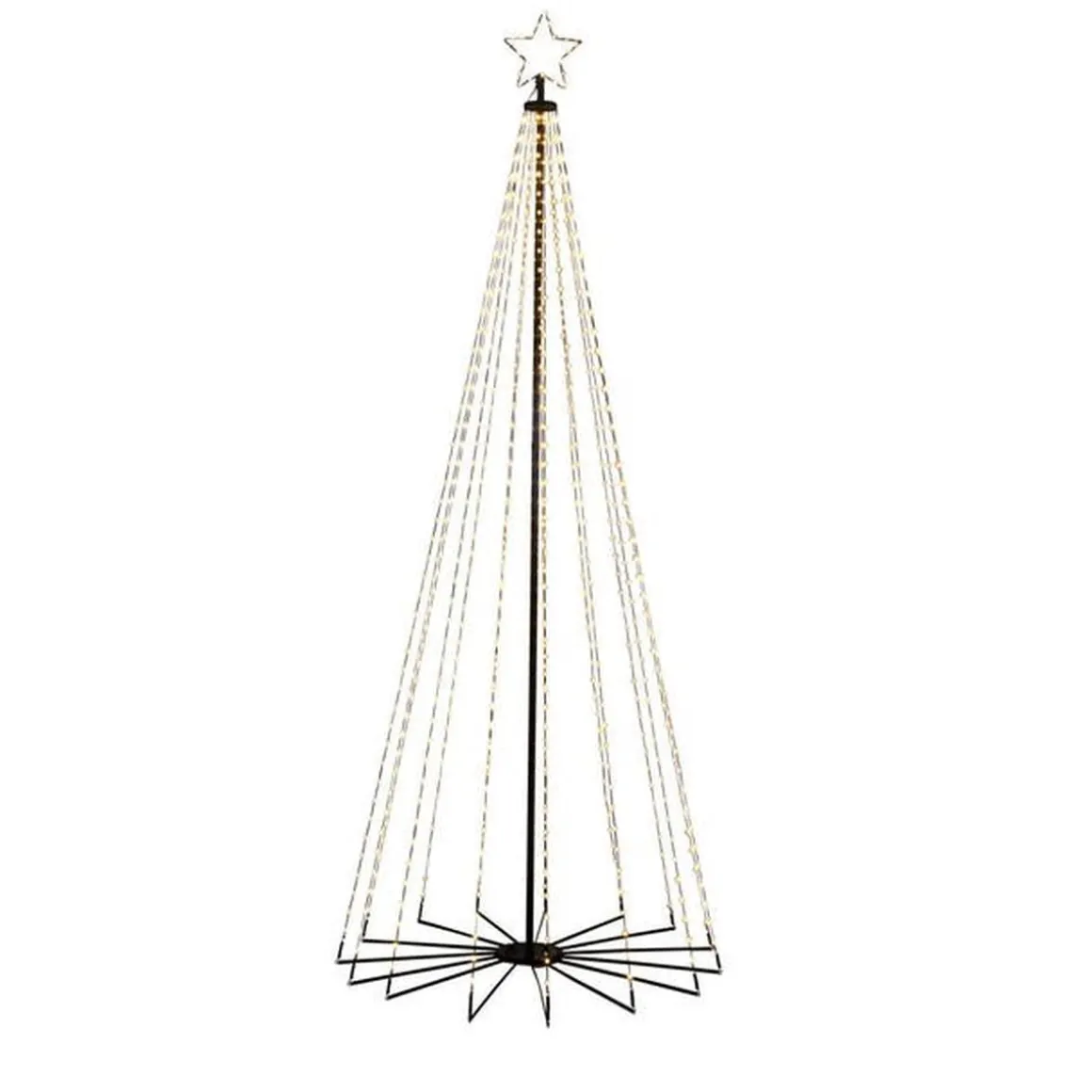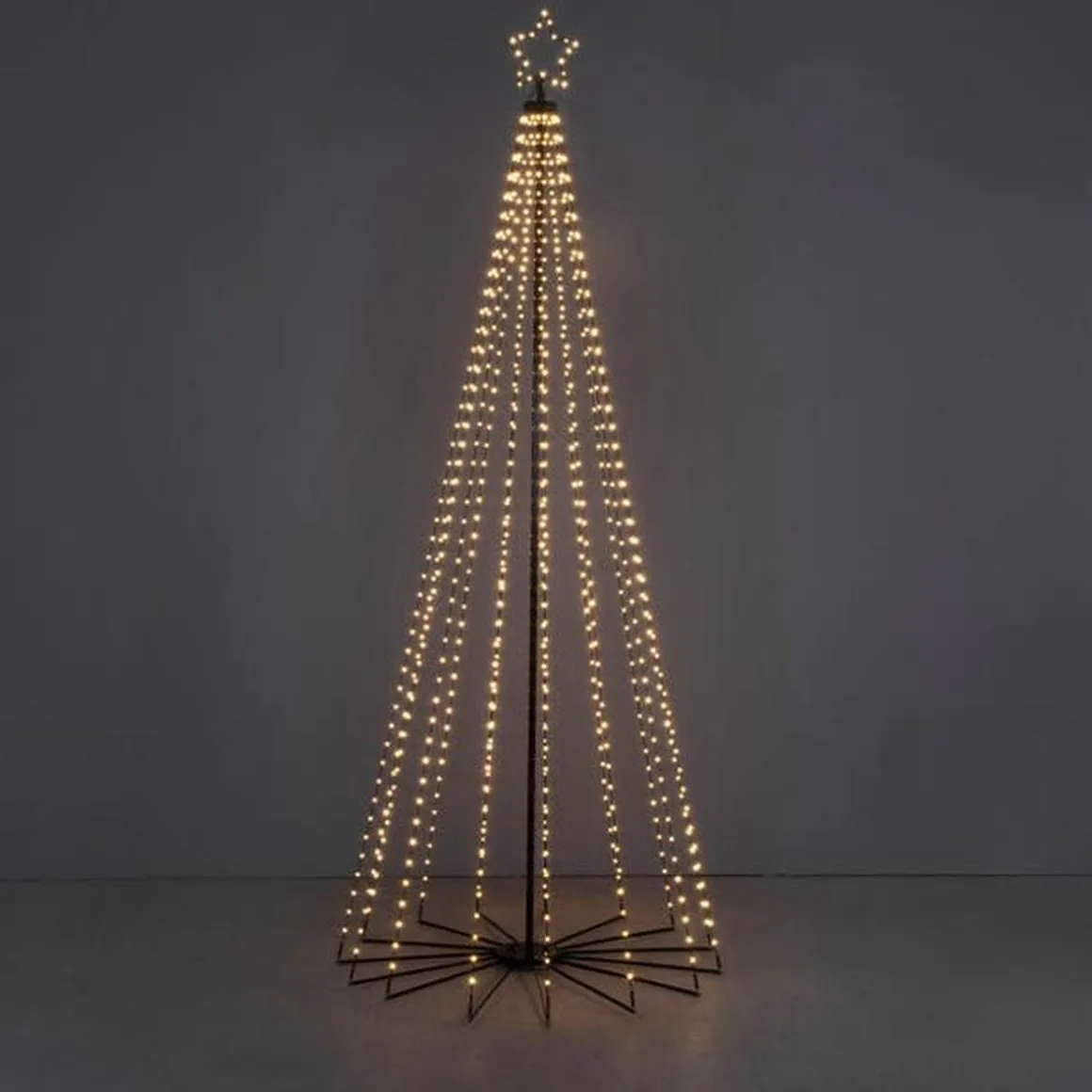 Et imponerende juletre i metall med varmhvite LED-lys – perfekt for å skape en magisk atmosfære i hagen eller på terrassen. Med sin elegante glød lyser det opp vintermørket og blir en iøynefallende dekorasjon. Enkel å montere og pålitelig for en glitrende og stemningsfull jul!