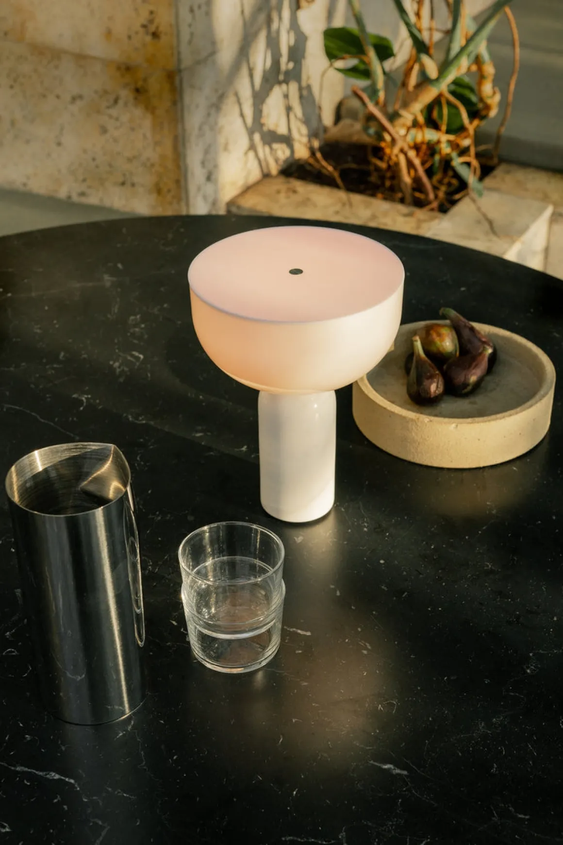 Kizu bordlampe balanserer dristige former og fascinerer øyet med sin skulpturelle komposisjon, og denne bærbare versjonen av lampen er intet unntak. Materialer og uttrykk er som vi kjenner dem, men denne trådløse, mindre størrelsen er lett å flytte rundt der det trengs lys. Med marmor som bæreelement får lampen naturlig stabilitet og den polerte steinen føles behagelig å ta på.