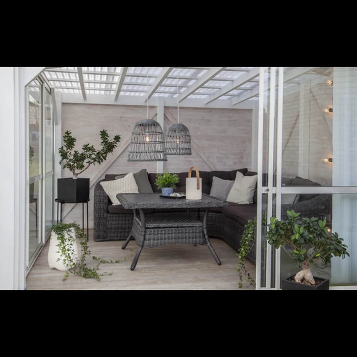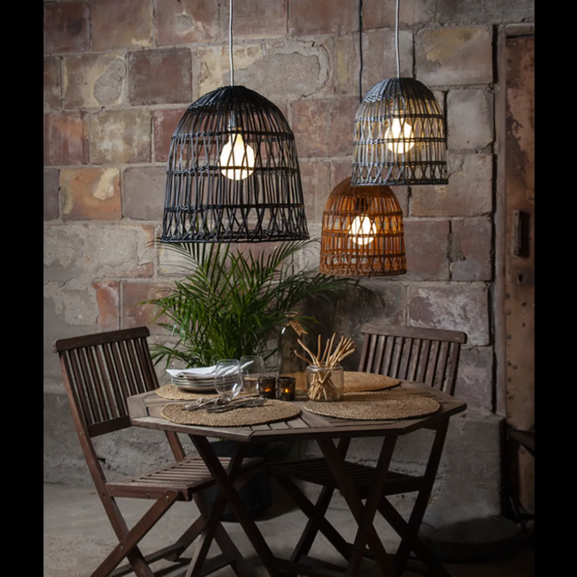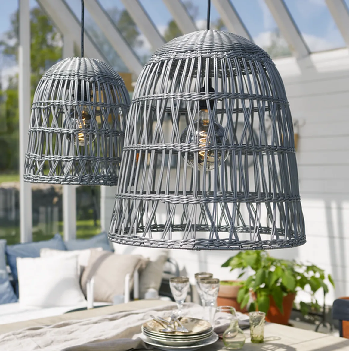 Nydelig lampeskjerm i kunstrotting som er egnet for utendørsbruk. Lampeskjermen er 33 cm høy og 30 cm i diameter.