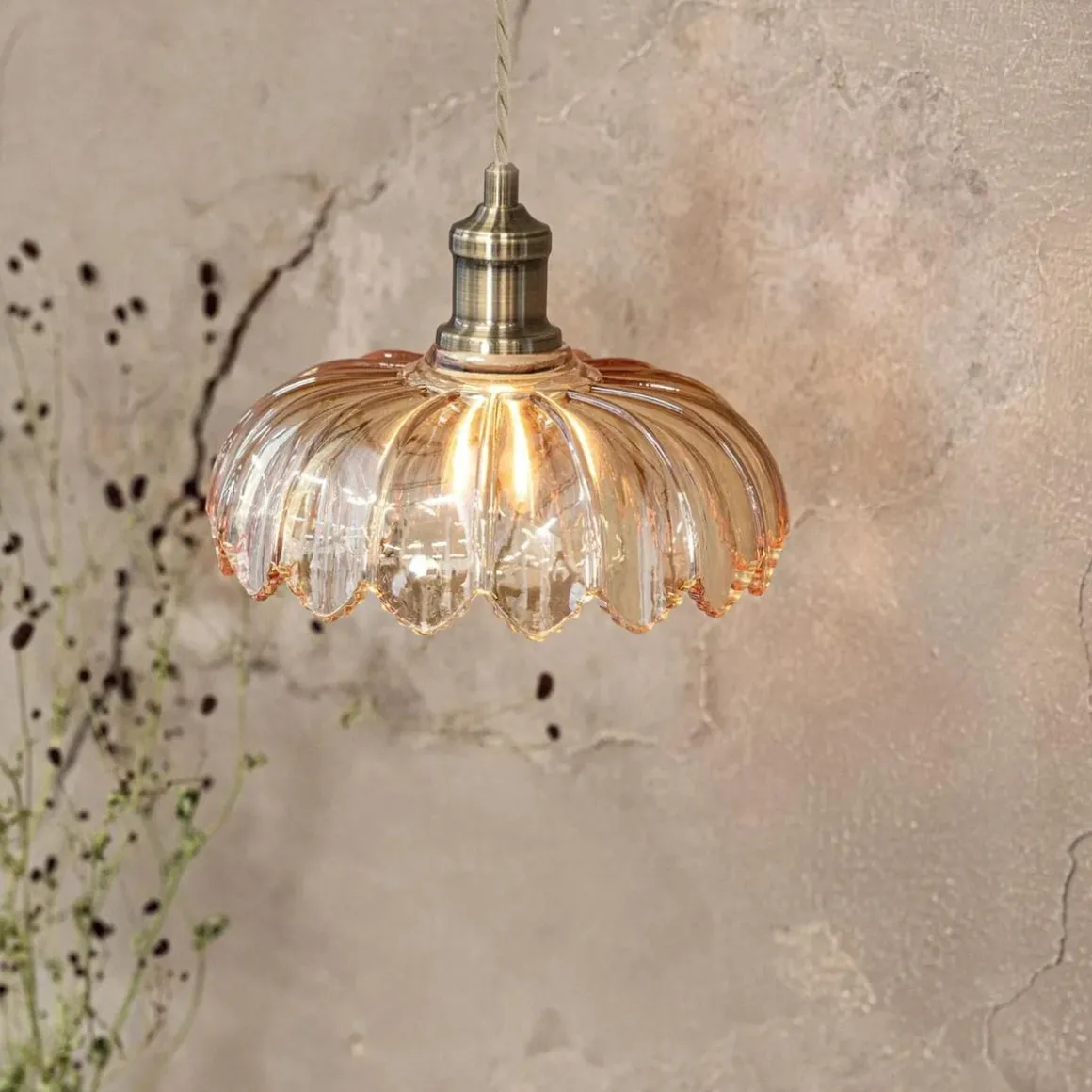 Taklampen i transparent amber farget glass med myke, bølgende former. Lampen har et lampefeste i messing og en dekorativ beige tvunnet tekstilledning som går til et rundt metallfeste i messing som monteres i taket.