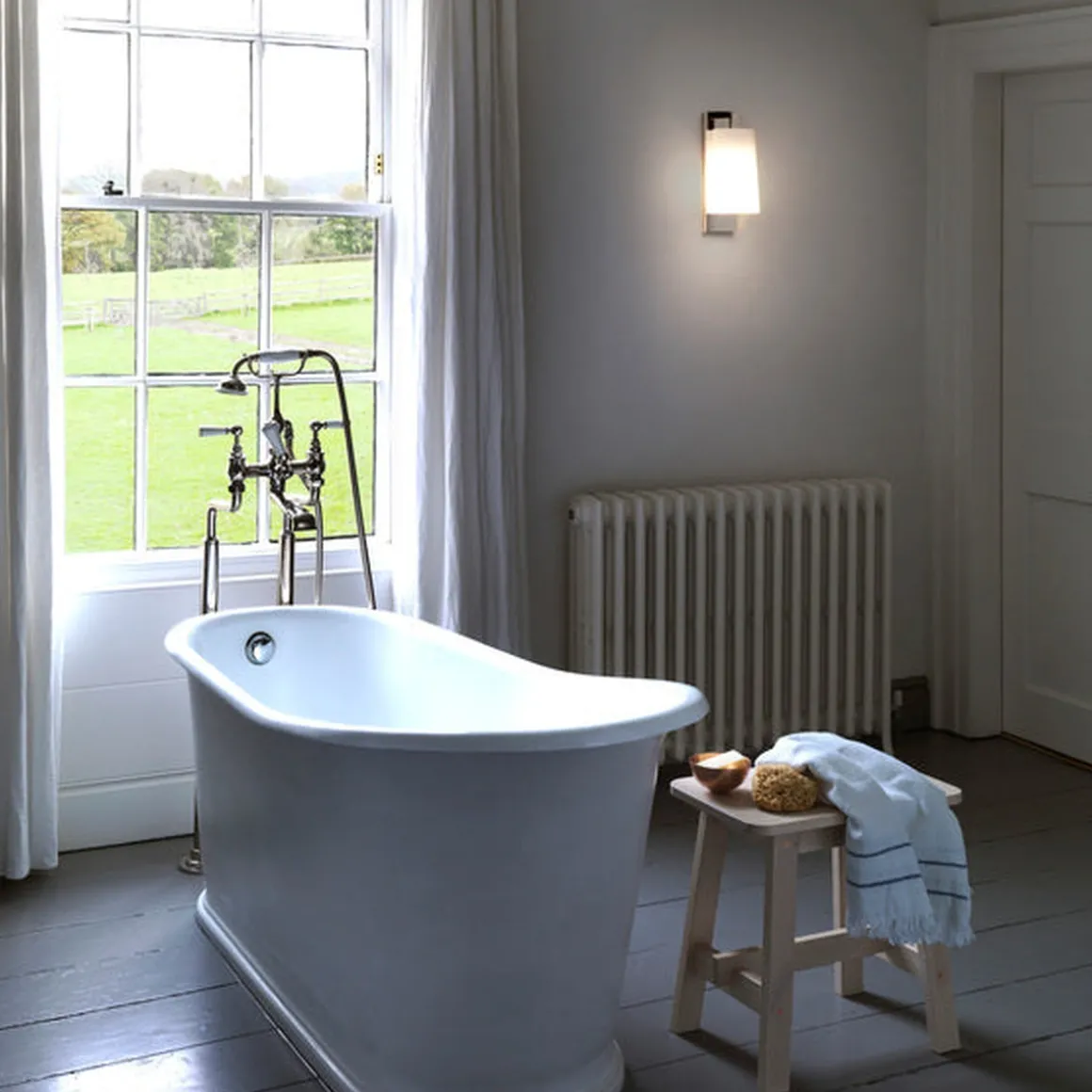 Lago er en stilfull vegglampe som kan brukes på baderommet. Modellen leveres i flere farger. Det er anbefalt at lampen med messing eller glass skjerm benyttes på baderommet.