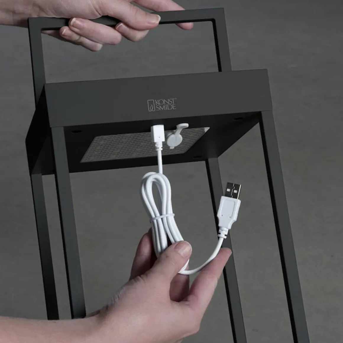 Den leveres med stativ til å henge lykten på hvis ønskelig samt USB ledning.