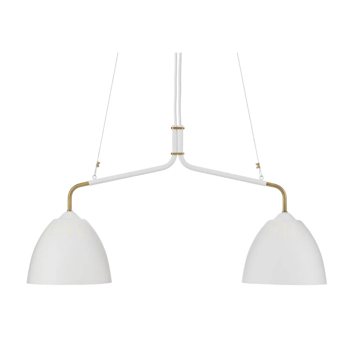 Lean er tilgjengelig i matt svart og hvit teksturfarge. Taklampen med to lyskilder, sprer lyset fint over spisebordet og tilfører en fin formdetalj til rommet. Små solide brett i rå messing følger med i wireopphenget og blir en flott ekstra detalj.
