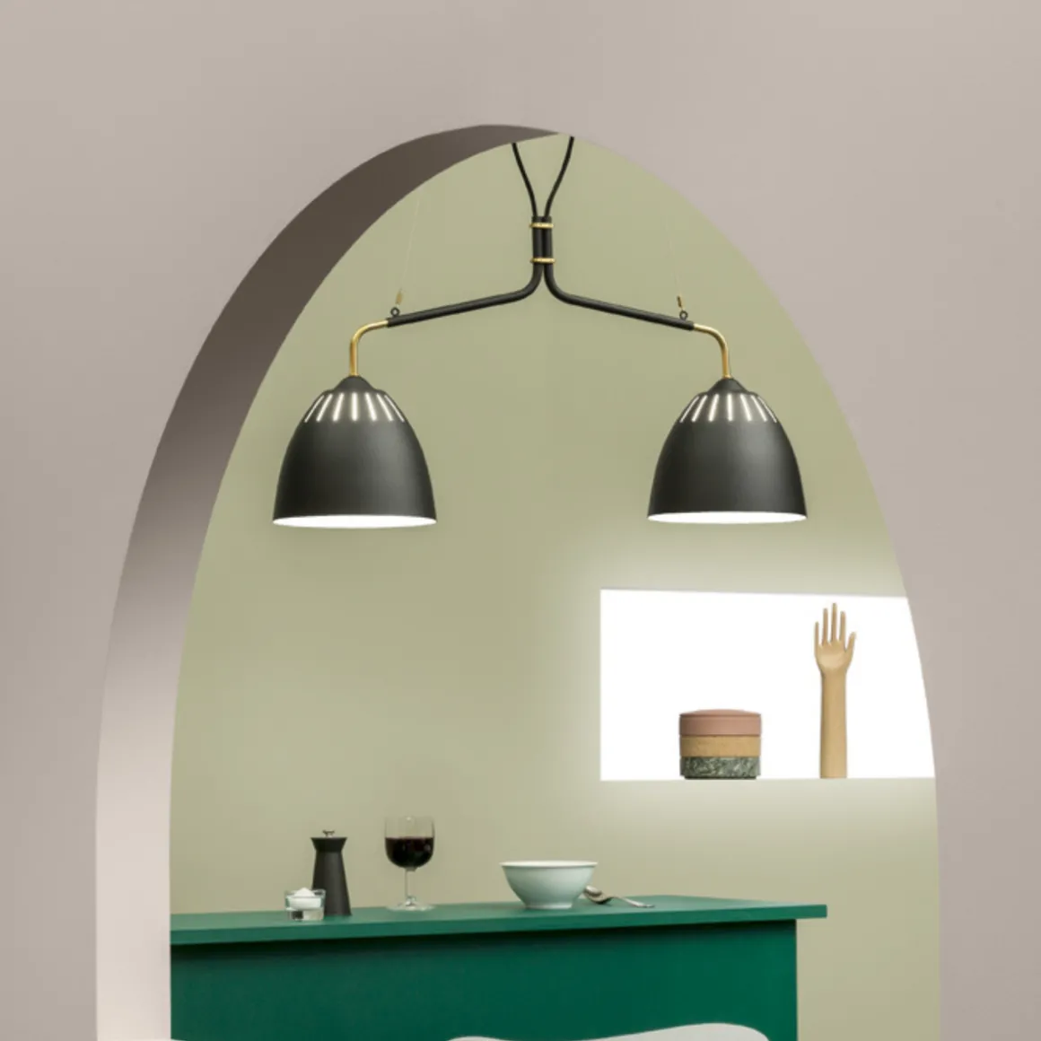 Lean er tilgjengelig i matt svart og hvit teksturfarge. Taklampen med to lyskilder, sprer lyset fint over spisebordet og tilfører en fin formdetalj til rommet. Små solide brett i rå messing følger med i wireopphenget og blir en flott ekstra detalj.