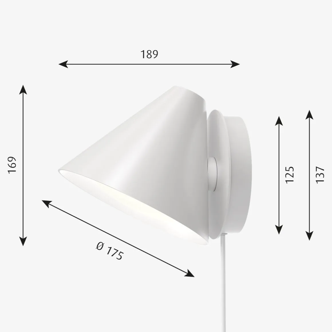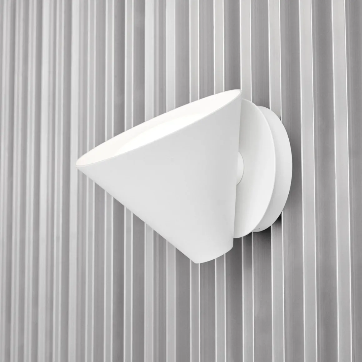 Vegglampens karakteristiske koniske skjerm har en innebygd buet avskjermer. Dette sikrer et attraktivt og blendefritt lys. Et svakt lys avgis også oppover gjennom en ensartet, diskré åpning i toppen av skjermen, for å gi en perfekt stemning. Armaturen kan monteres vendt nedover for å lede lyset eller oppover for en indirekte belysningsløsning. Den buede avskjermeren gir et glimt av innsiden av skjermen, samtidig som den reduserer eventuell blending. Keglen Vegg kan monteres for å lede lyset nedover eller oppover. Lampeskjermen er justerbar og kan rotere 45 grader til hver side for å rette lyset der det er nødvendig. Bryteren og dimmeren er plassert på sokkelen. På sokkelen kommer ledningen ut på siden eller armaturen kan monteres direkte på en stikkontakt.