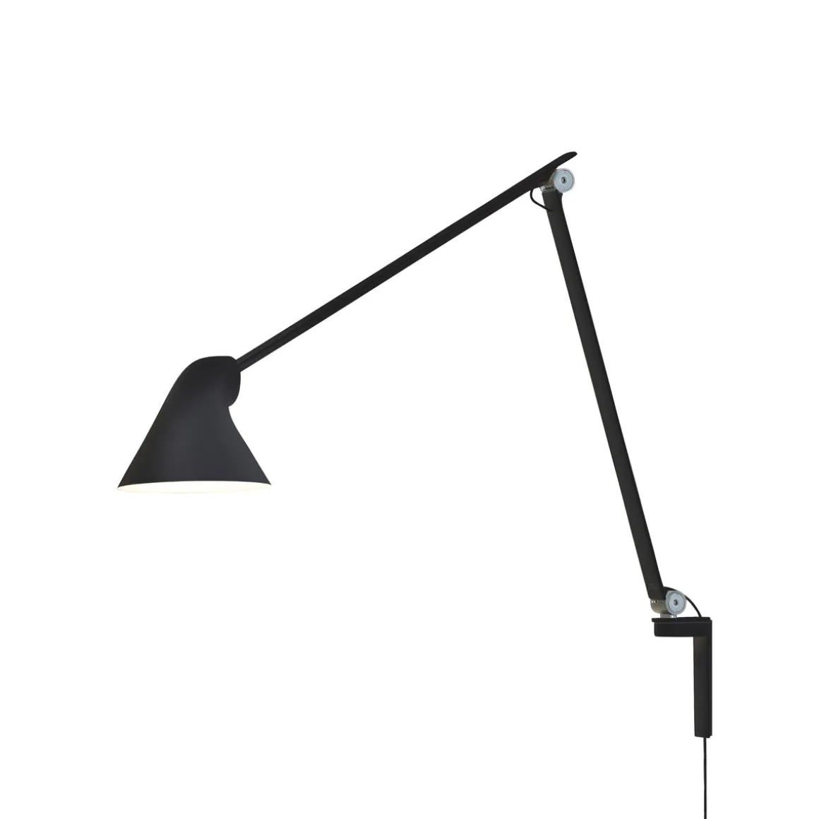 Louis Poulsen NJP vegglampe gir direkte, blendefritt, horisontalt lys og reflekterer samtidig noe av lyset gjennom baksiden av hodet slik at øvre del av armen lyses opp. Armaturhodets ergonomiske design former lyset og sørger for en optimal lysretning. Et enkelt mekanisk system gir stor bevegelsesfrihet, slik at lyset alltid kan stilles inn på det perfekte stedet. Skjermen er malt hvit på innsiden og reflekterer behagelig, diffust lys.