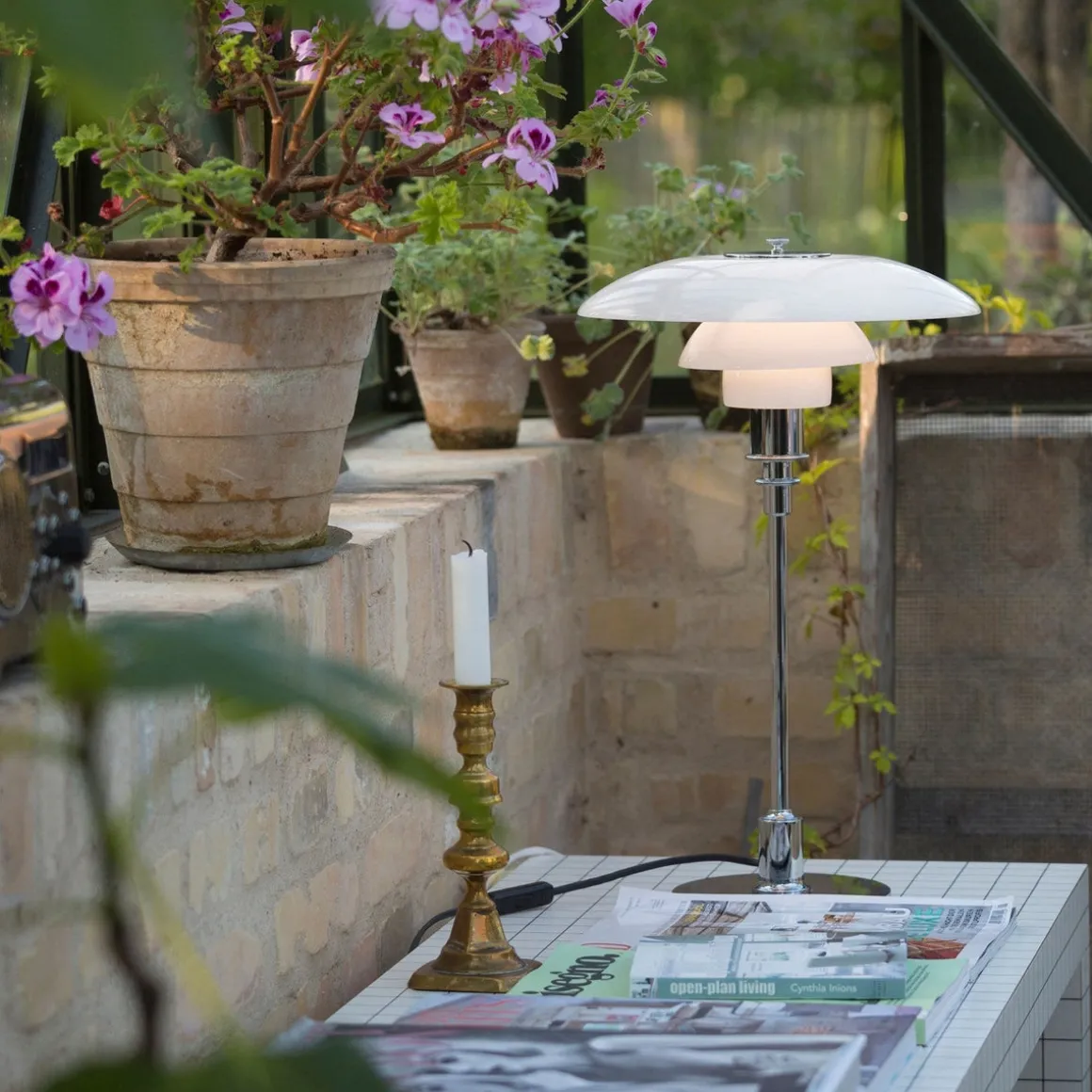 - Materiale: Munnblåst hvitt opalt glass. Base og stamme: høyglanset krombelagt messing