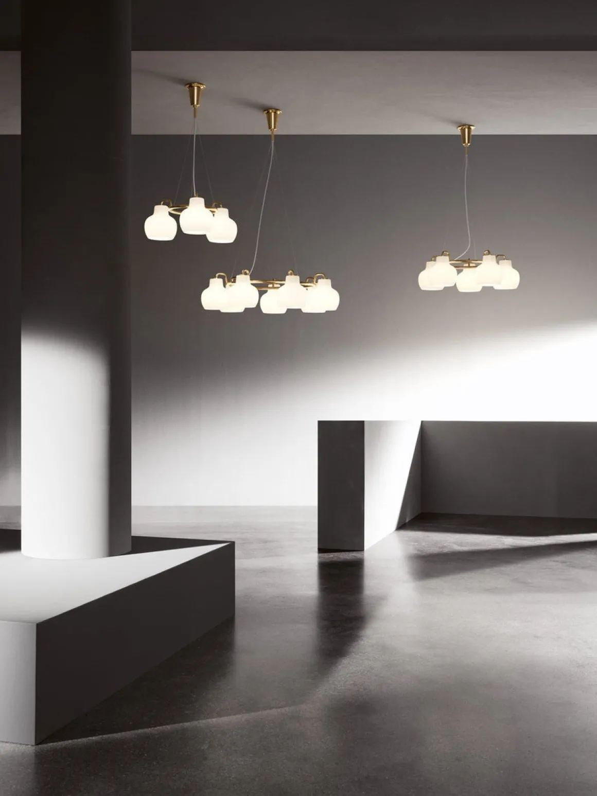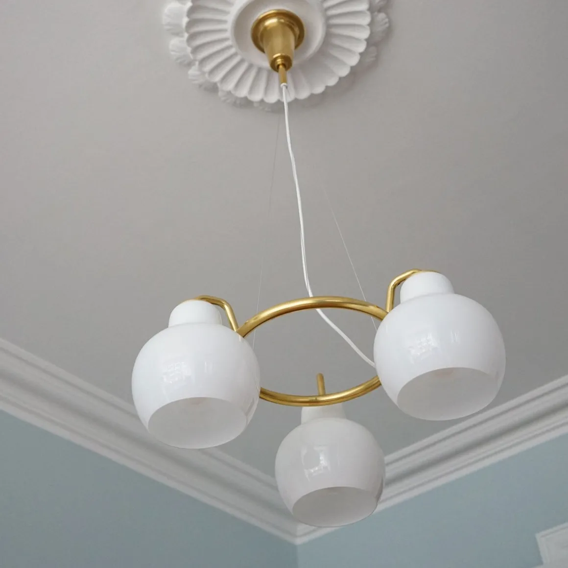 - Materiale: Skjermer: Munnblåst, 3-lags opalt glass. Wirer til Ring Crown: Rustfritt stål. Ramme og baldakin i ubehandlet messing, utvikler patina over tid.