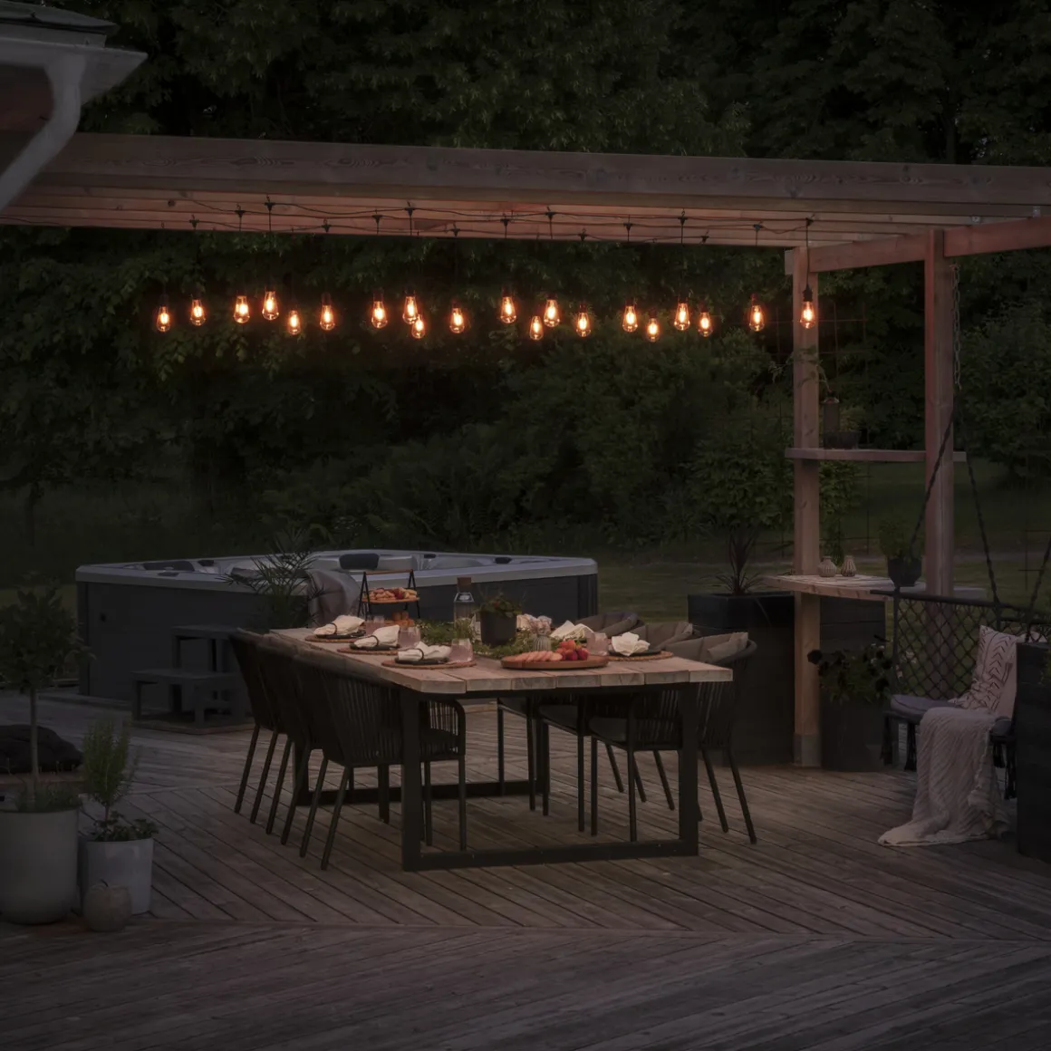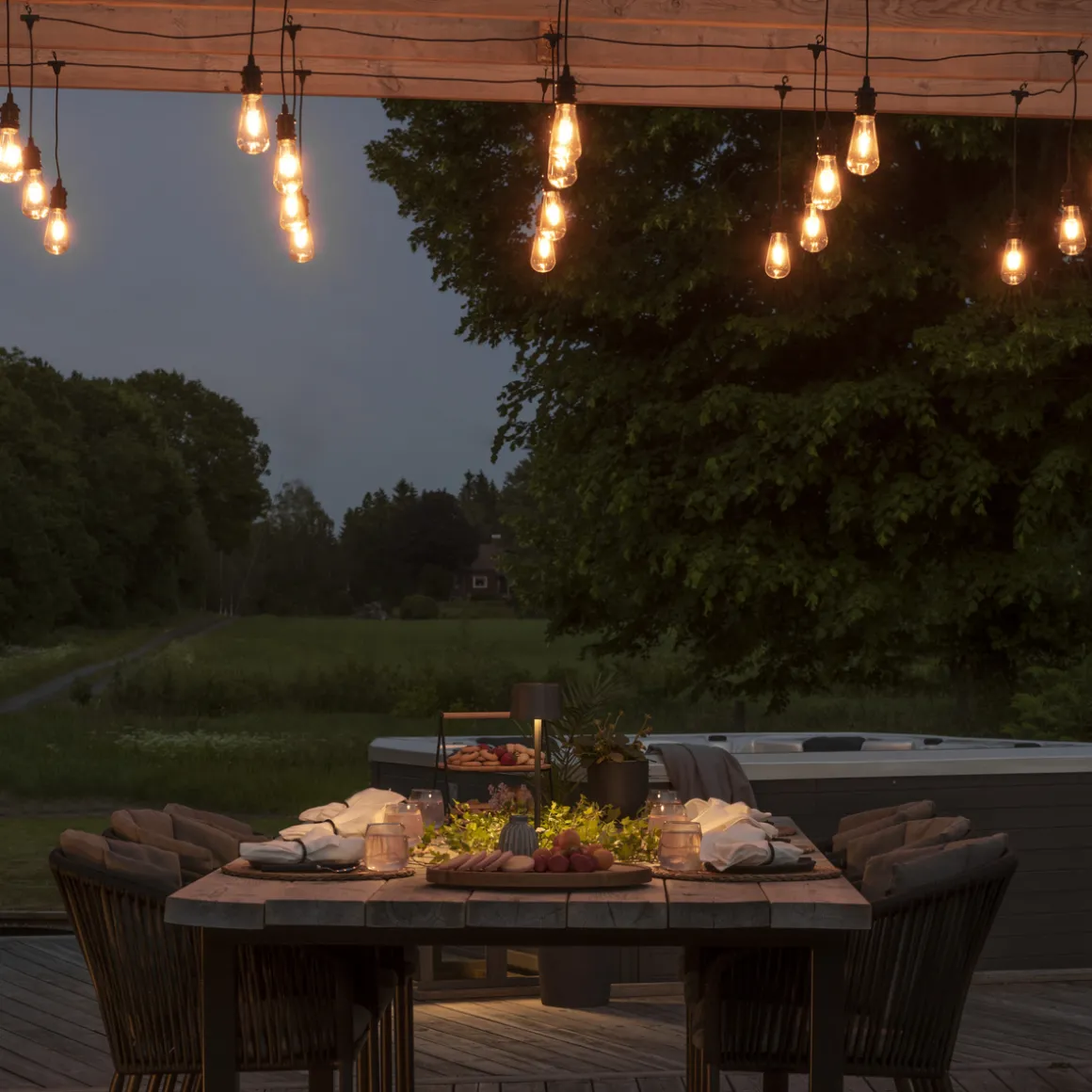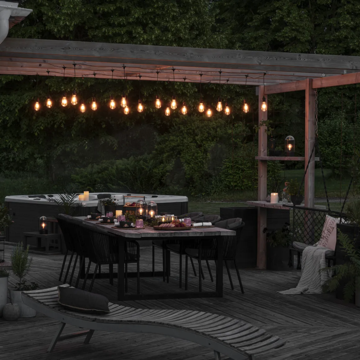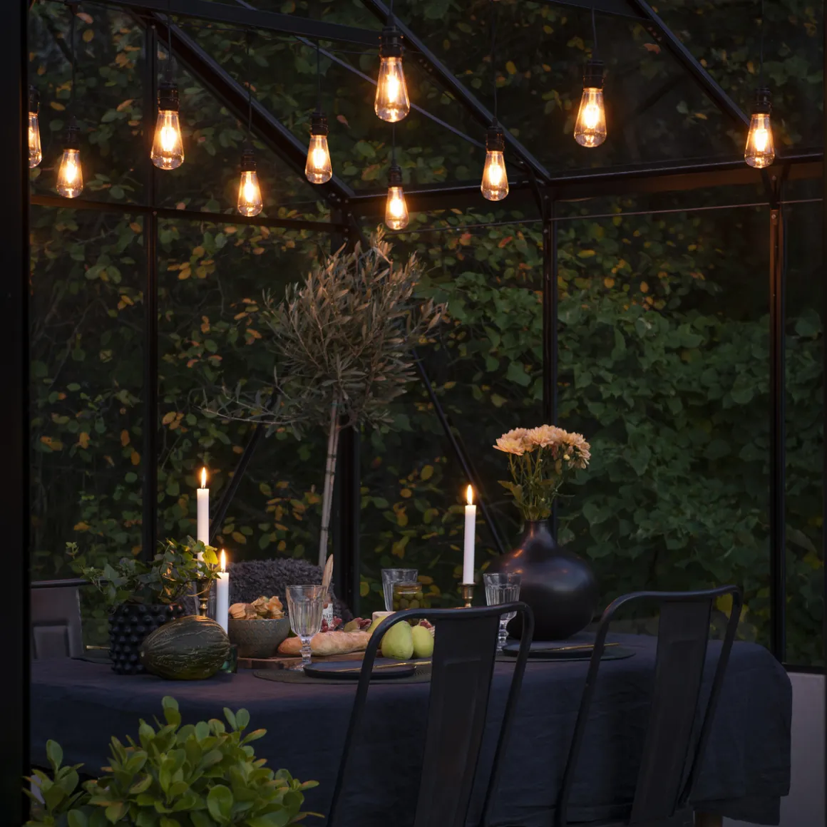 Nydelig lysslynge med amberfarget/varmt lys, som er med på å skape ekstra koselig stemning. Lyspærene henger ned fra hovedledningen og har krok på hvert lyspunkt. Lysslyngen leveres med transformator som har innebygget dimmer, slik at du kan justere lysstyrken etter behov.