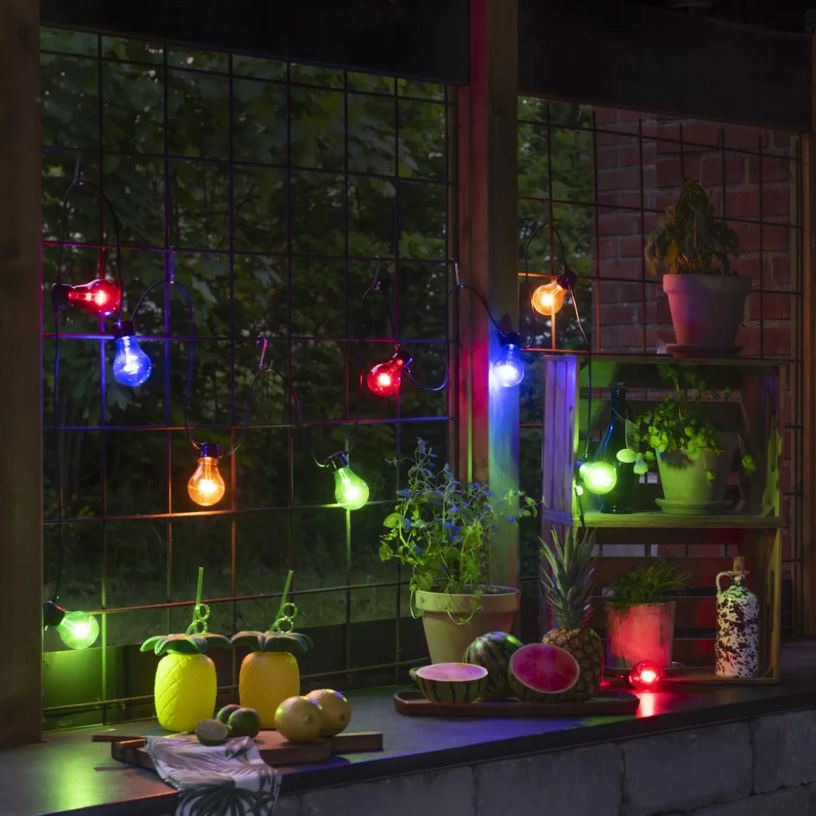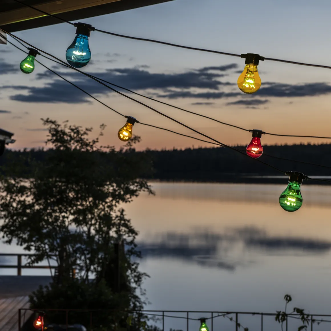 Lysslynge med 10 flerfargede LED-lamper. Faststøpte lyspærer og kuppel i plast som gjør dem uknuselig. Lysene i ulike farger er med på å skape ekstra leken, men koselig stemning.