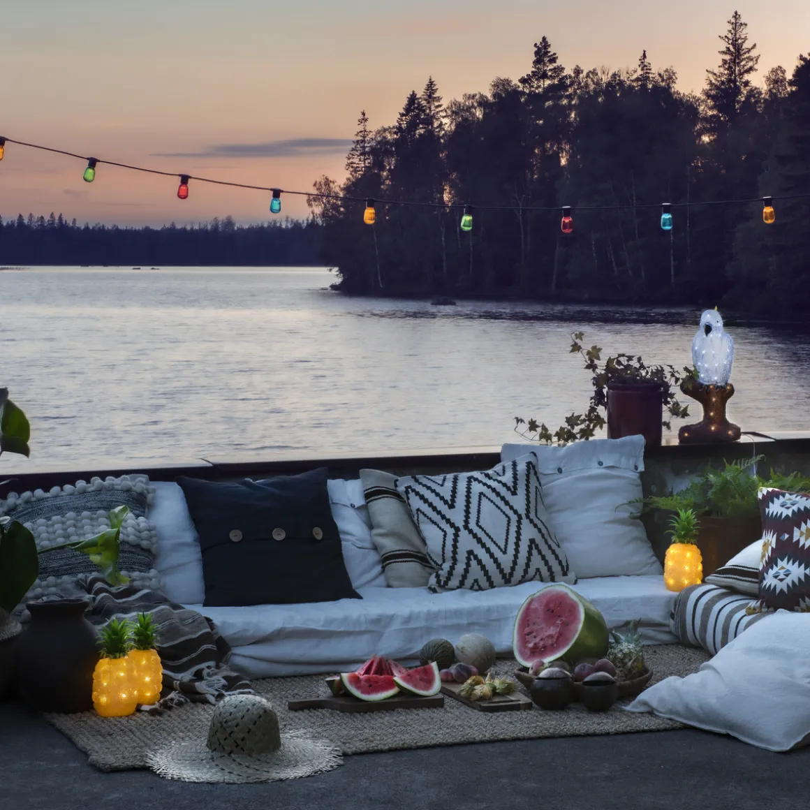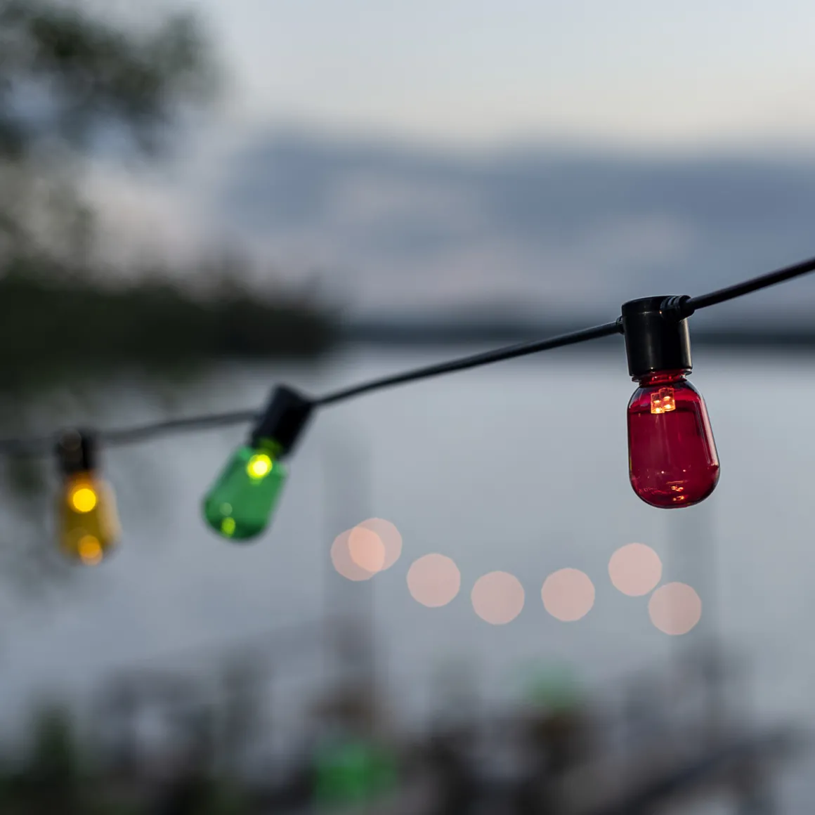 Lysslynge med 20 flerfargede LED-lamper. Faststøpte lyspærer og kuppel i plast som gjør dem uknuselig. Lysene i ulike farger er med på å skape ekstra leken, men koselig stemning. Lyspærene er 5 cm høye og 3 cm i diameter.