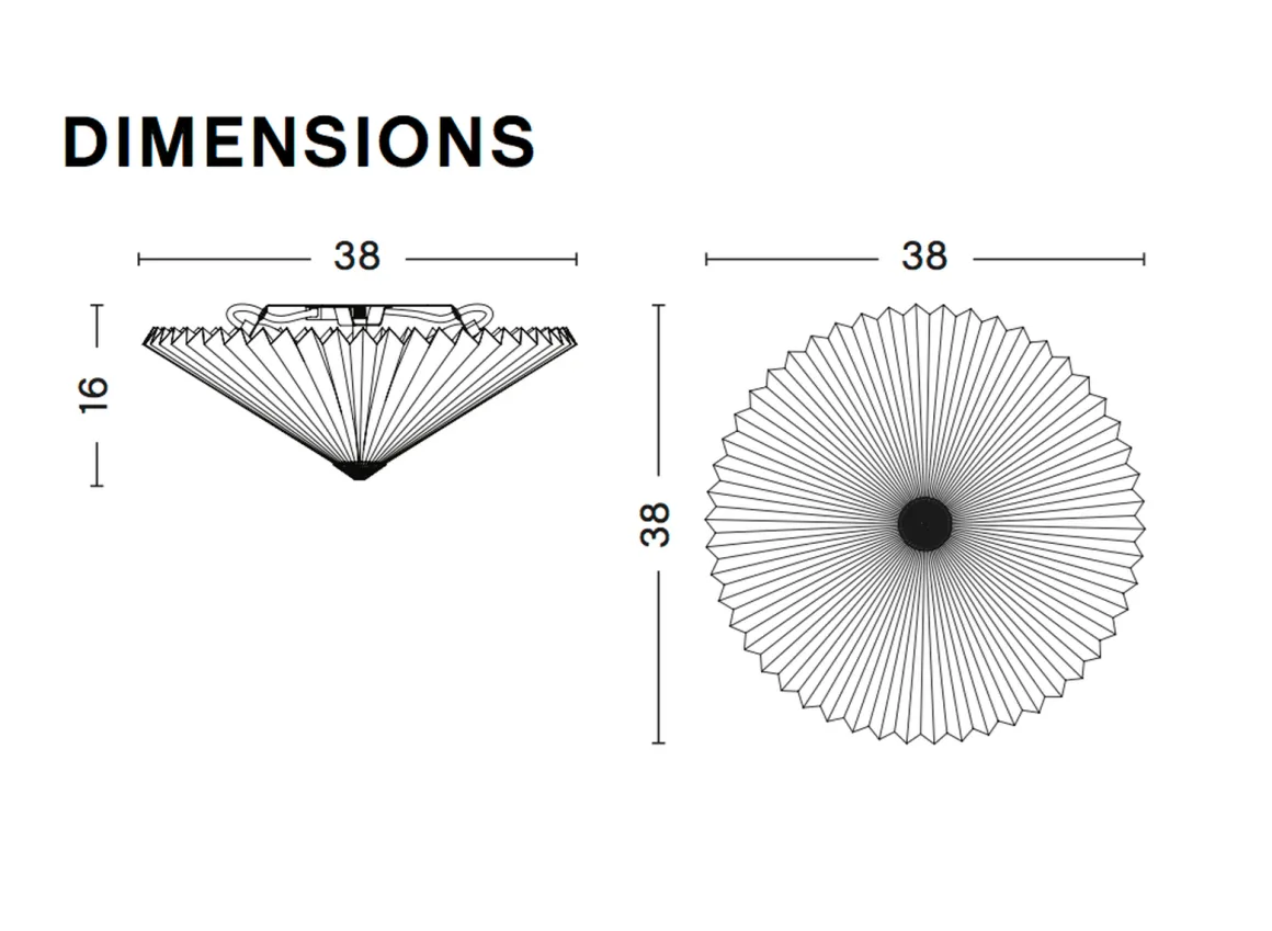Matin Tak og Vegg-lampe har et moderne men poetisk design, med en konstruksjon som kombinerer visuell delikatesse med fysisk robusthet. Den takmonterte modellen består av et lakkert stålbeslag for montering på veggen eller i taket, kombinert med en plissert stoffskjerm. Skjermen er tilgjengelig i to størrelser og flere fine farger.