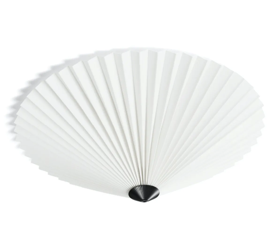 Matin Tak og Vegg-lampe har et moderne men poetisk design, med en konstruksjon som kombinerer visuell delikatesse med fysisk robusthet. Den takmonterte modellen består av et lakkert stålbeslag for montering på veggen eller i taket, kombinert med en plissert stoffskjerm. Skjermen er tilgjengelig i to størrelser og flere fine farger.