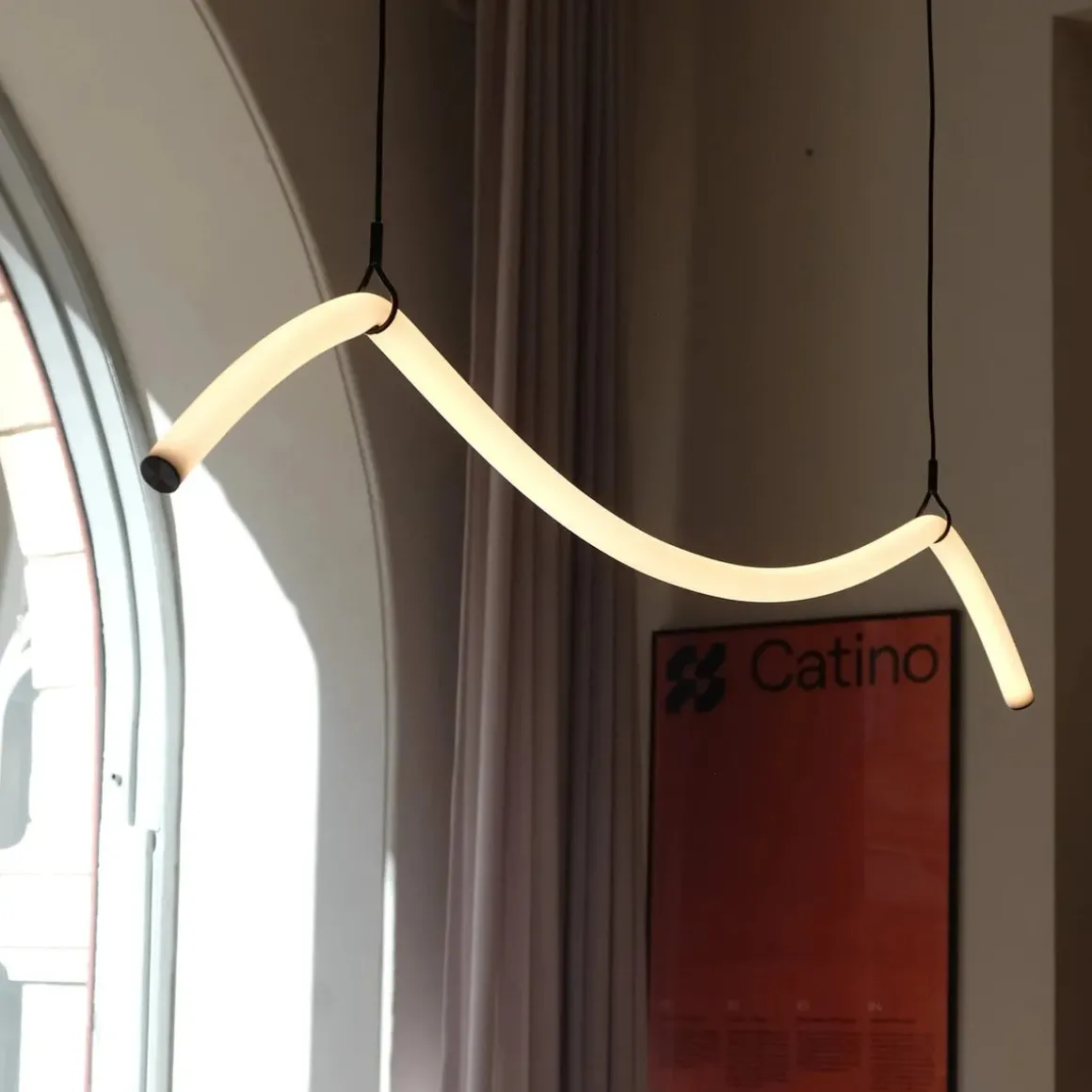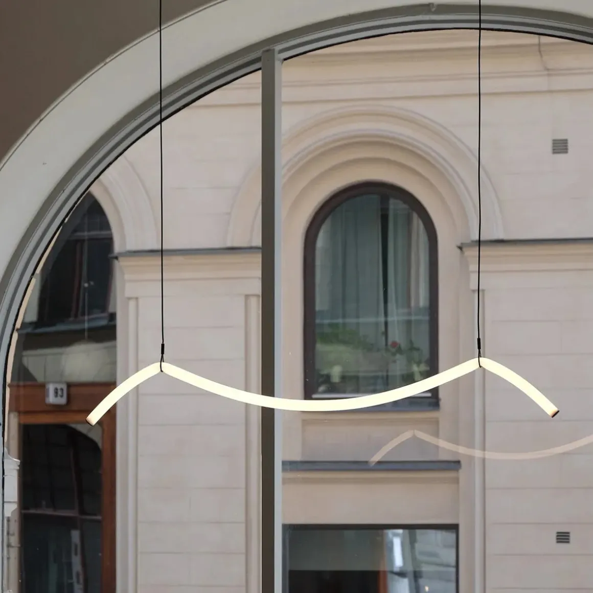 Den svevende konstruksjonen, opphengt i to pene snorer, får lyskilden til å virke som om den svever fritt i rommet – som et glødende rør uten begynnelse eller slutt. Resultatet er en installasjon som vekker nysgjerrighet, overrasker øyet og gir rommet et kunstnerisk uttrykk.